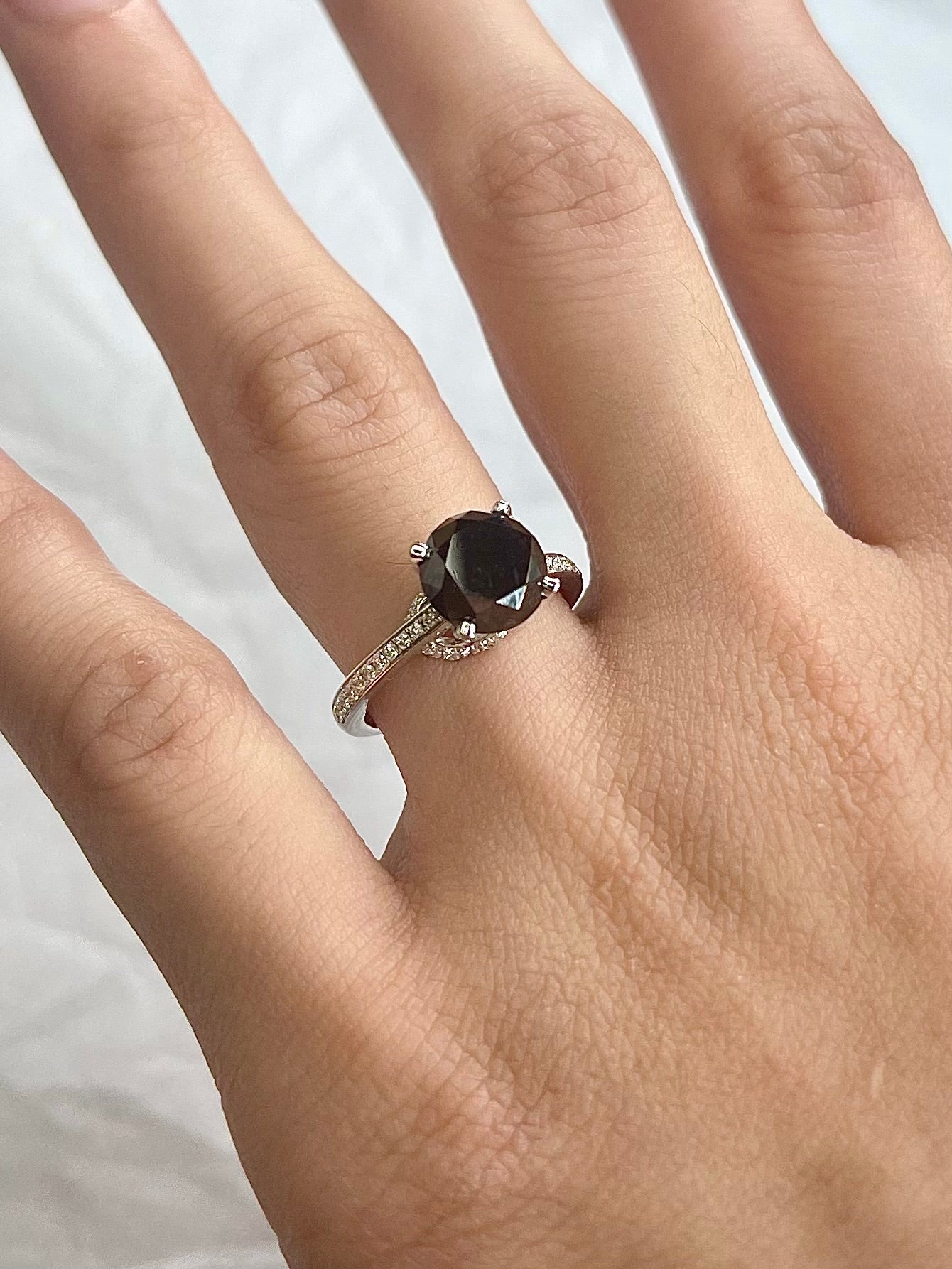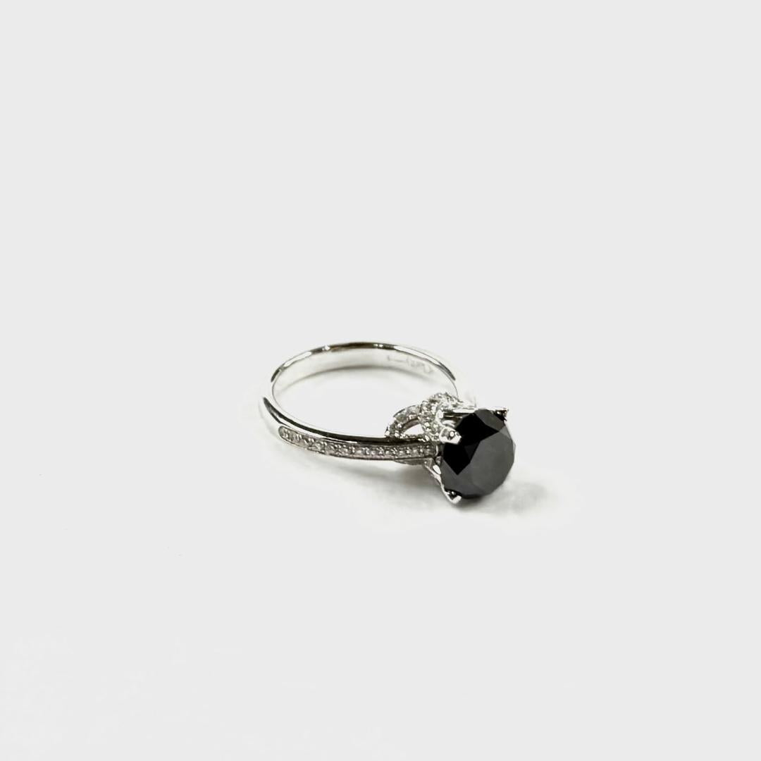 A striking ring featuring a 2.62-carat round black diamond, complemented by 52 round brilliant diamonds totaling 0.34 carats. Set in 18k white gold, this design exudes bold elegance. (18k, natural)