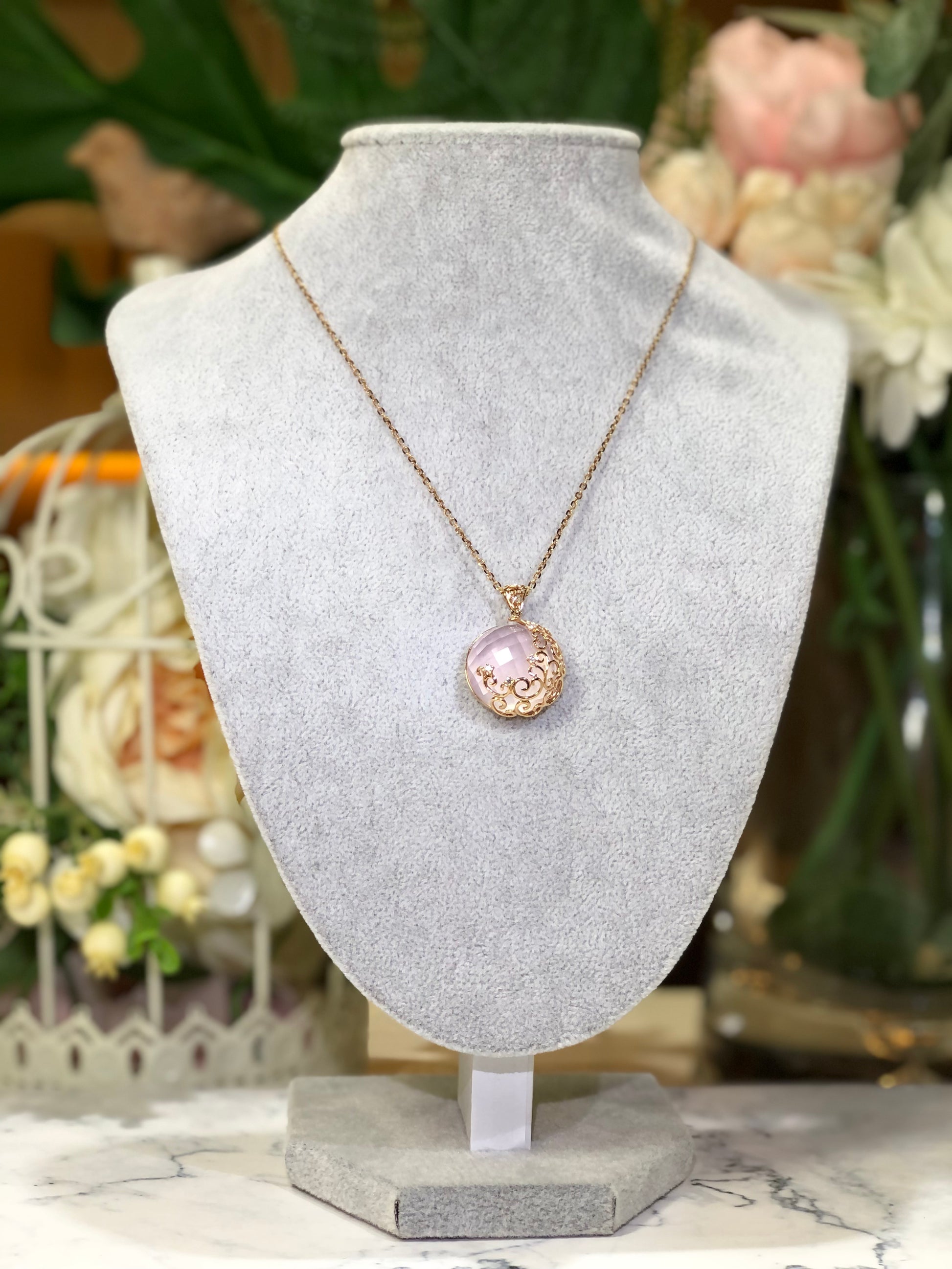 A stunning necklace featuring a 25.35-carat rose quartz, complemented by 4 round brilliant diamonds totaling 0.055 carats. Set in 18k rose gold, this elegant design showcases the soft beauty of rose quartz paired with the brilliance of diamonds. (18k, natural)