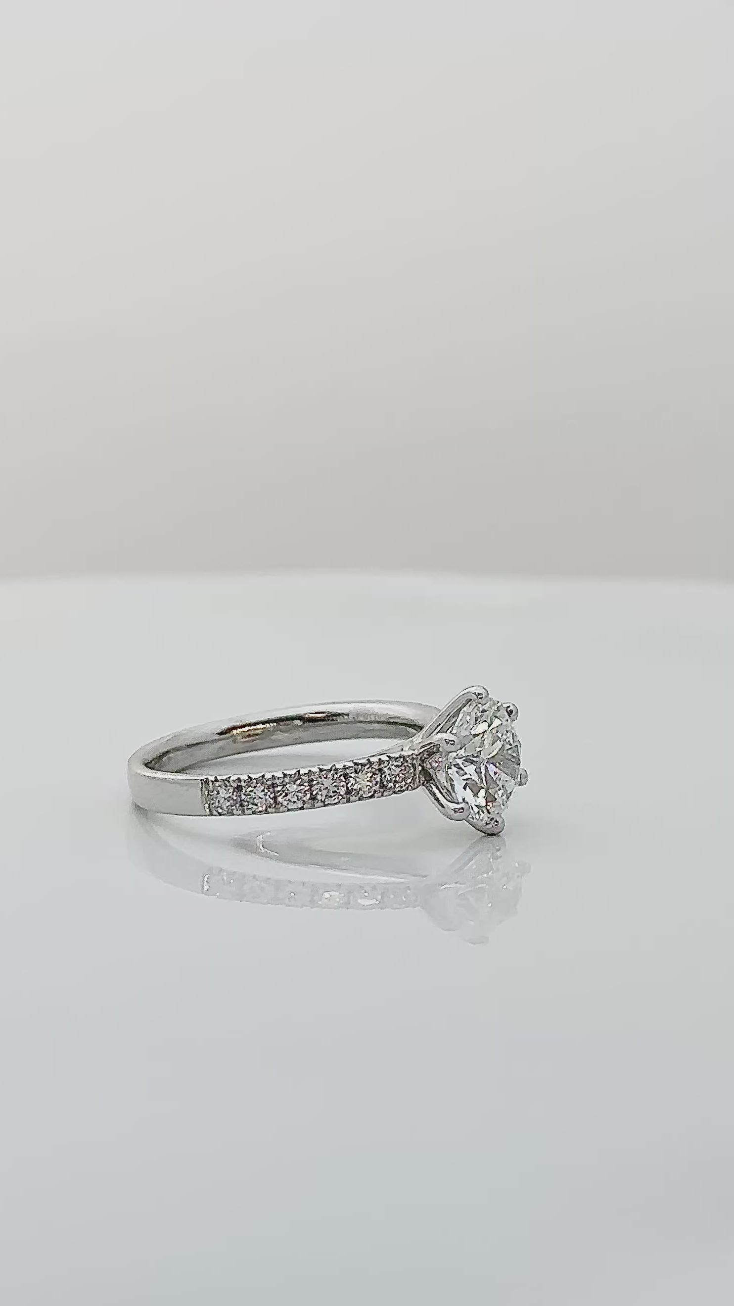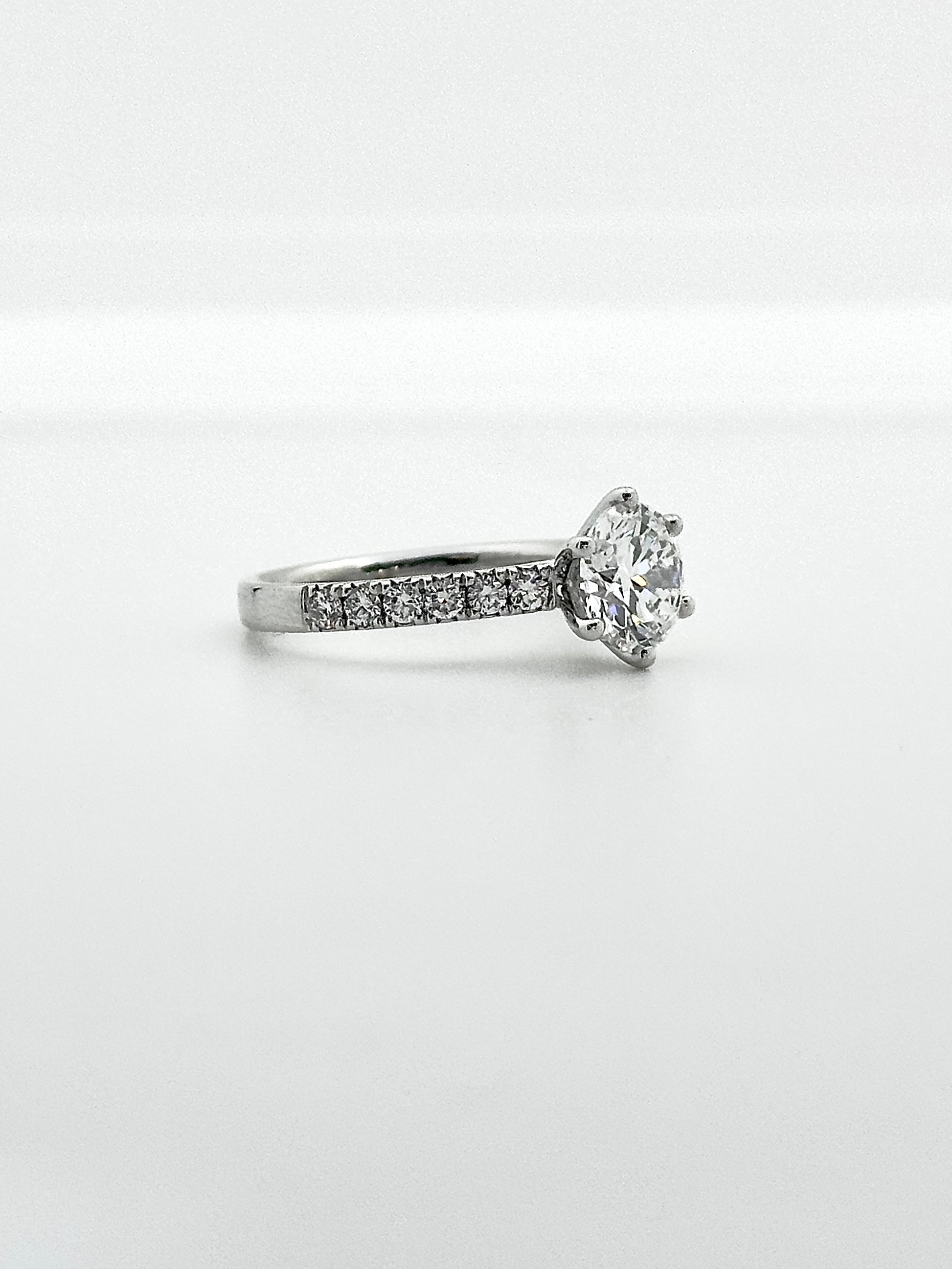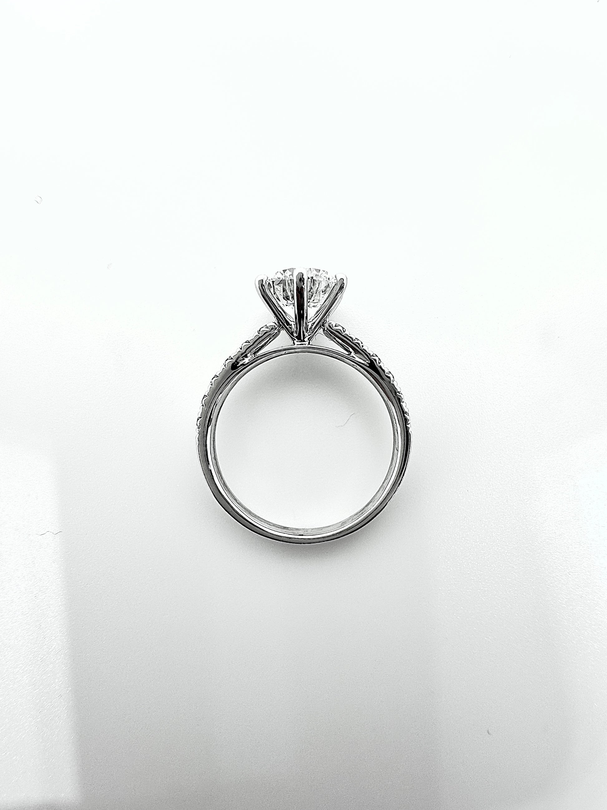 A timeless classic with beautifully balanced proportions, this ring showcases a 1.5 carat colorless round brilliant diamond that radiates pure brilliance from every angle. Framed by a classic setting accented with delicate round diamonds along the band, the design enhances the center stone while preserving a clean, elegant silhouette.