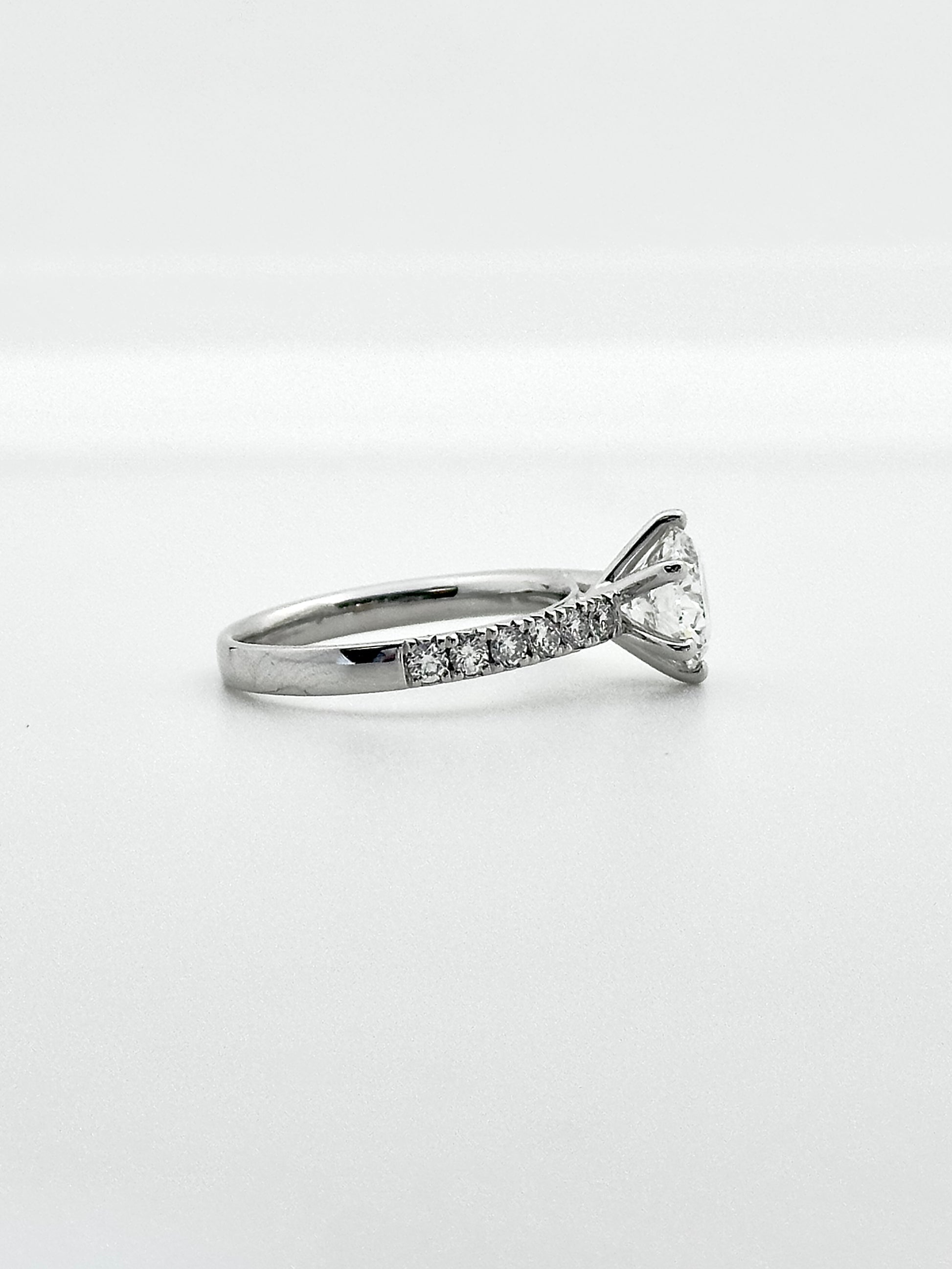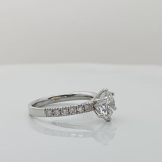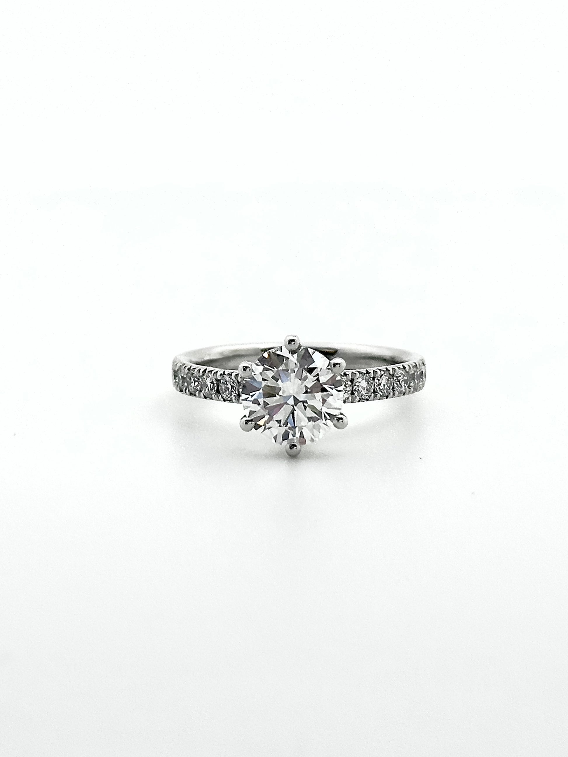 A timeless classic with beautifully balanced proportions, this ring showcases a 1.5 carat colorless round brilliant diamond that radiates pure brilliance from every angle. Framed by a classic setting accented with delicate round diamonds along the band, the design enhances the center stone while preserving a clean, elegant silhouette.