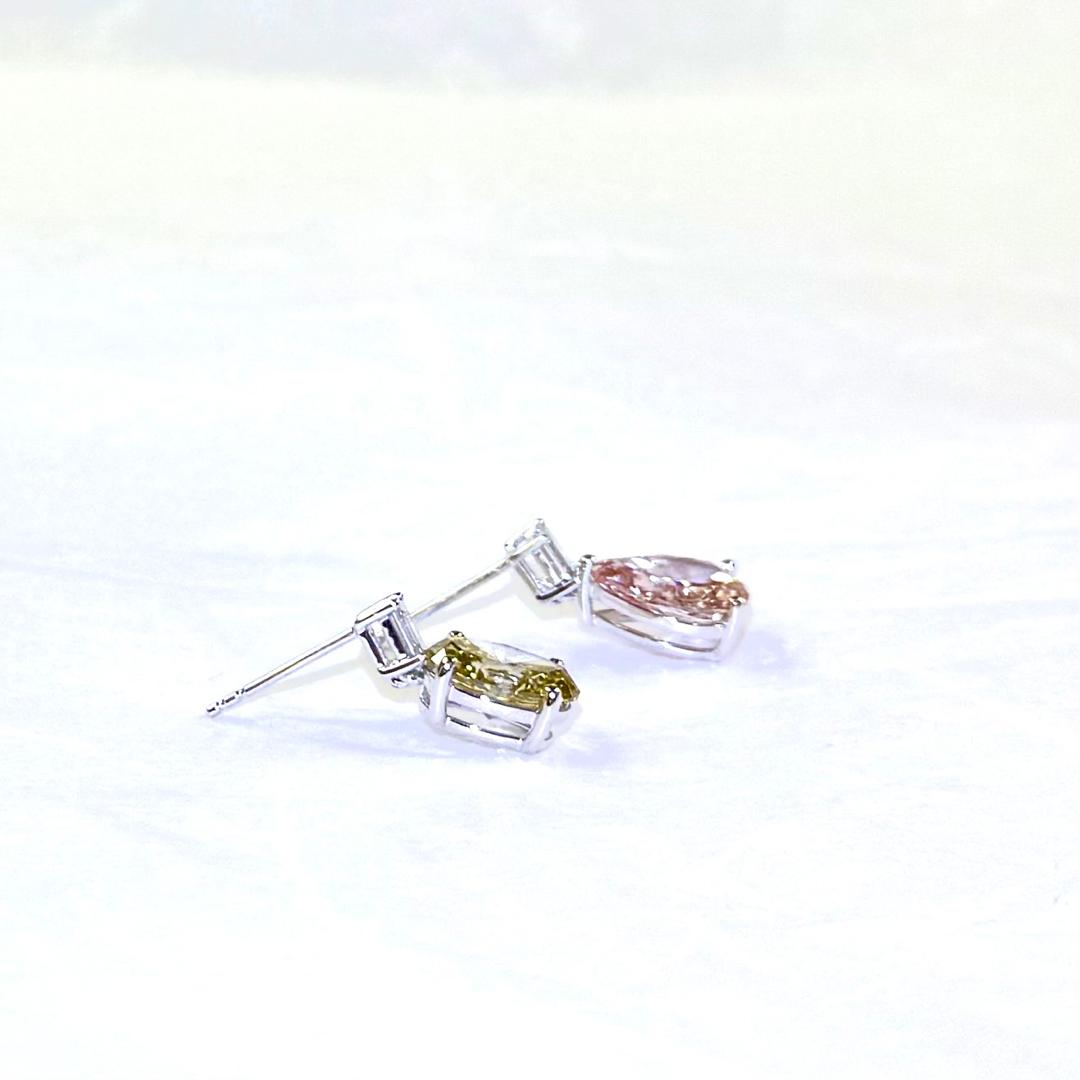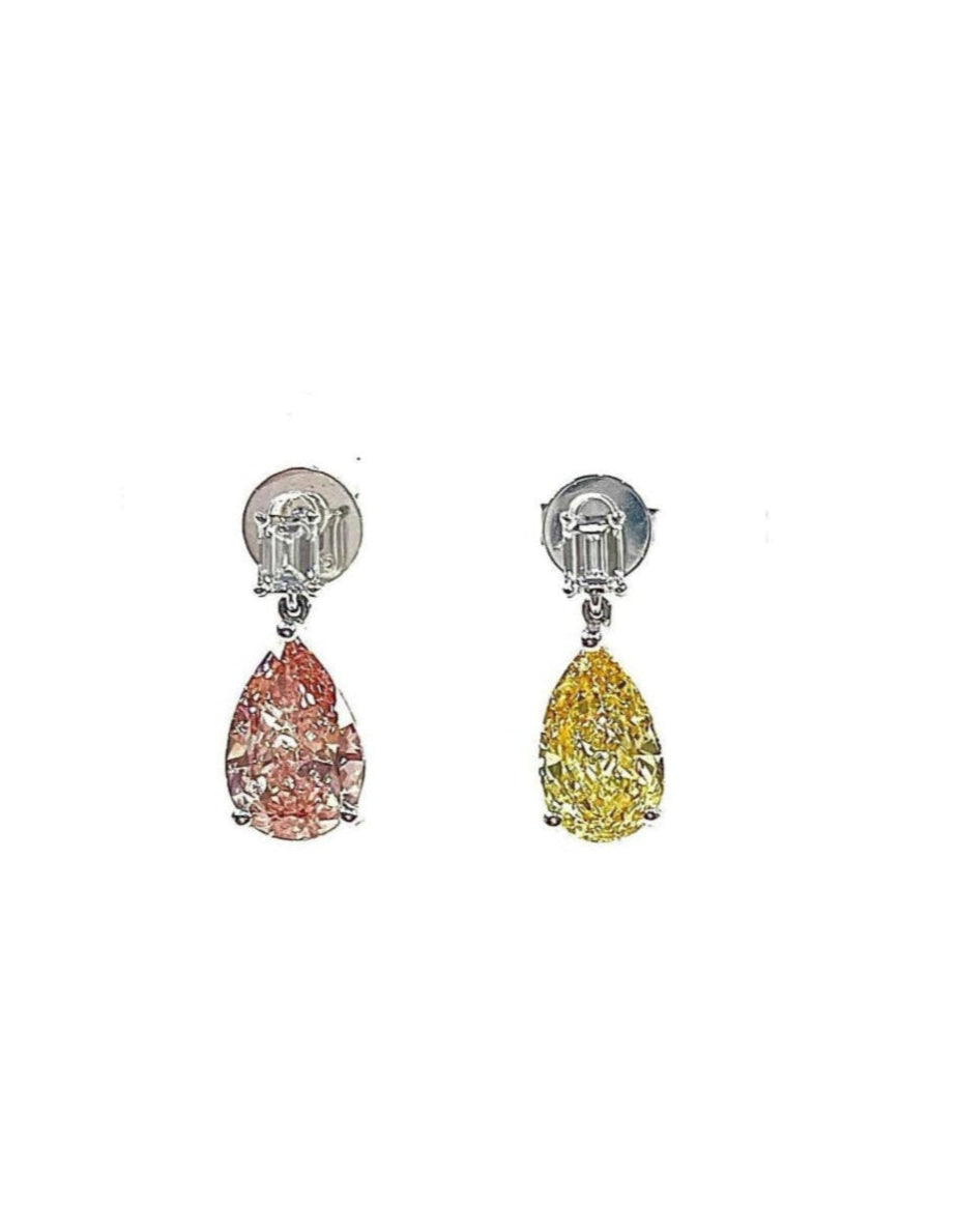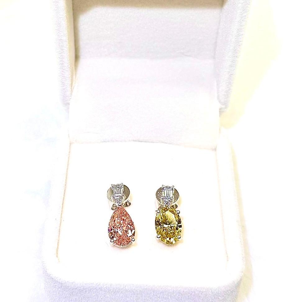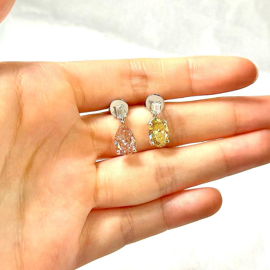 An exquisite pair of earrings featuring a 2-carat pear-shaped pink diamond and a 2-carat oval-shaped yellow diamond. Accented with two cushion-cut diamonds totaling 0.5 carats, set in 14k white gold for a timeless elegance. (14k, labgrown)