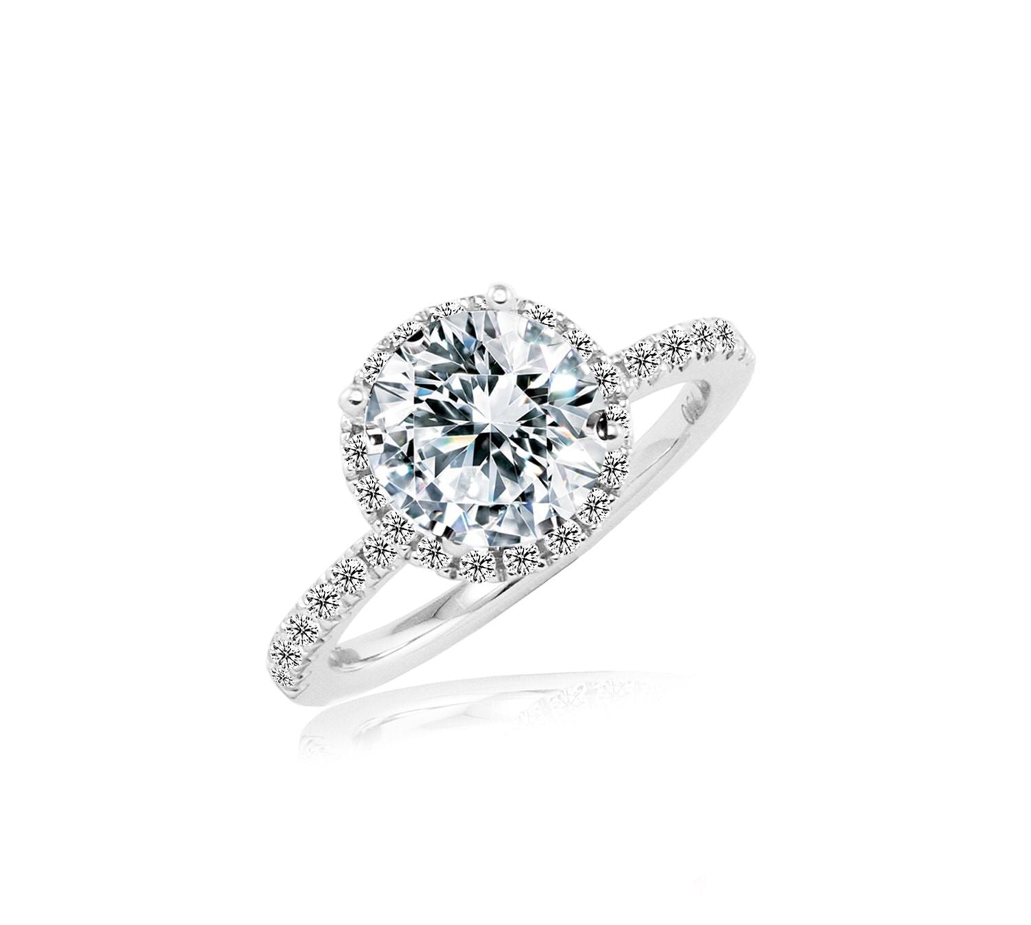 Diamond ring setting embraced by 4 prongs scintillating with 36 round brilliant diamonds 0.24 carat in 18k gold, white. Can be crafted to set a centre diamond sizes 0.30 to 3ct, white, rose, yellow, platinum. (Halo Collection)