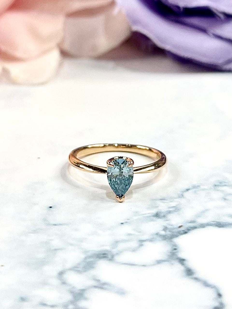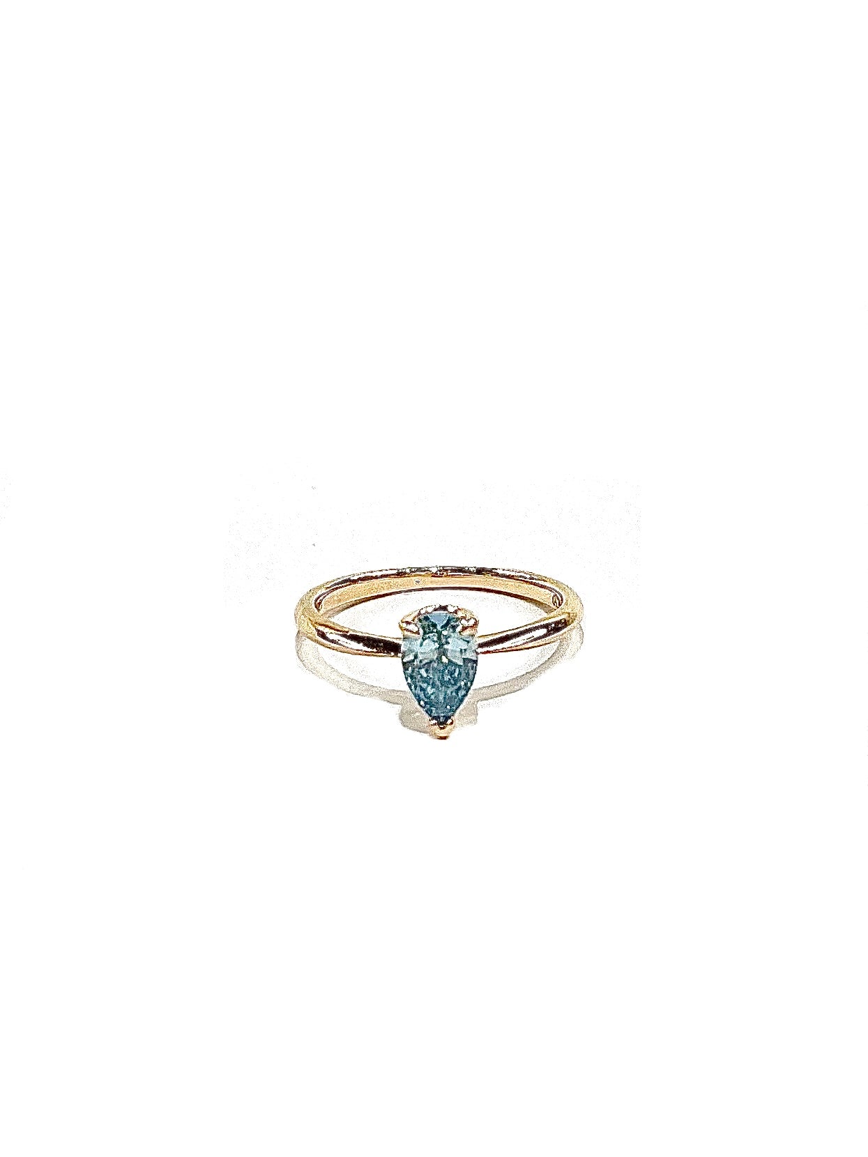 A delicate expression of modern romance, this ring features a 0.50-carat pear-shaped blue diamond, prized for its rare hue and brilliance. Set in a slender rose gold band, the design enhances the diamond’s vibrant color while maintaining a refined and contemporary silhouette. With its graceful proportions and unique character, this piece is a captivating symbol of individuality and love.