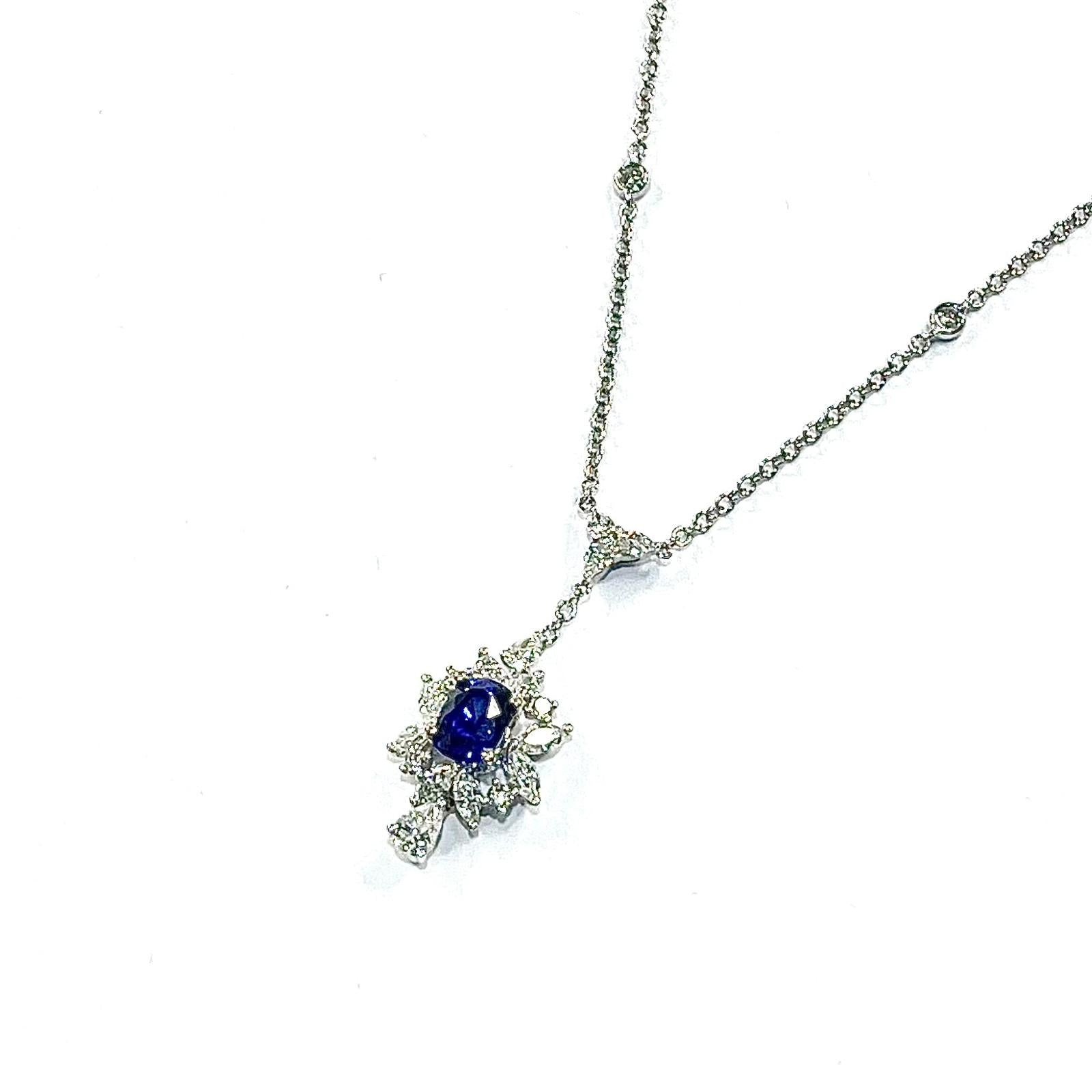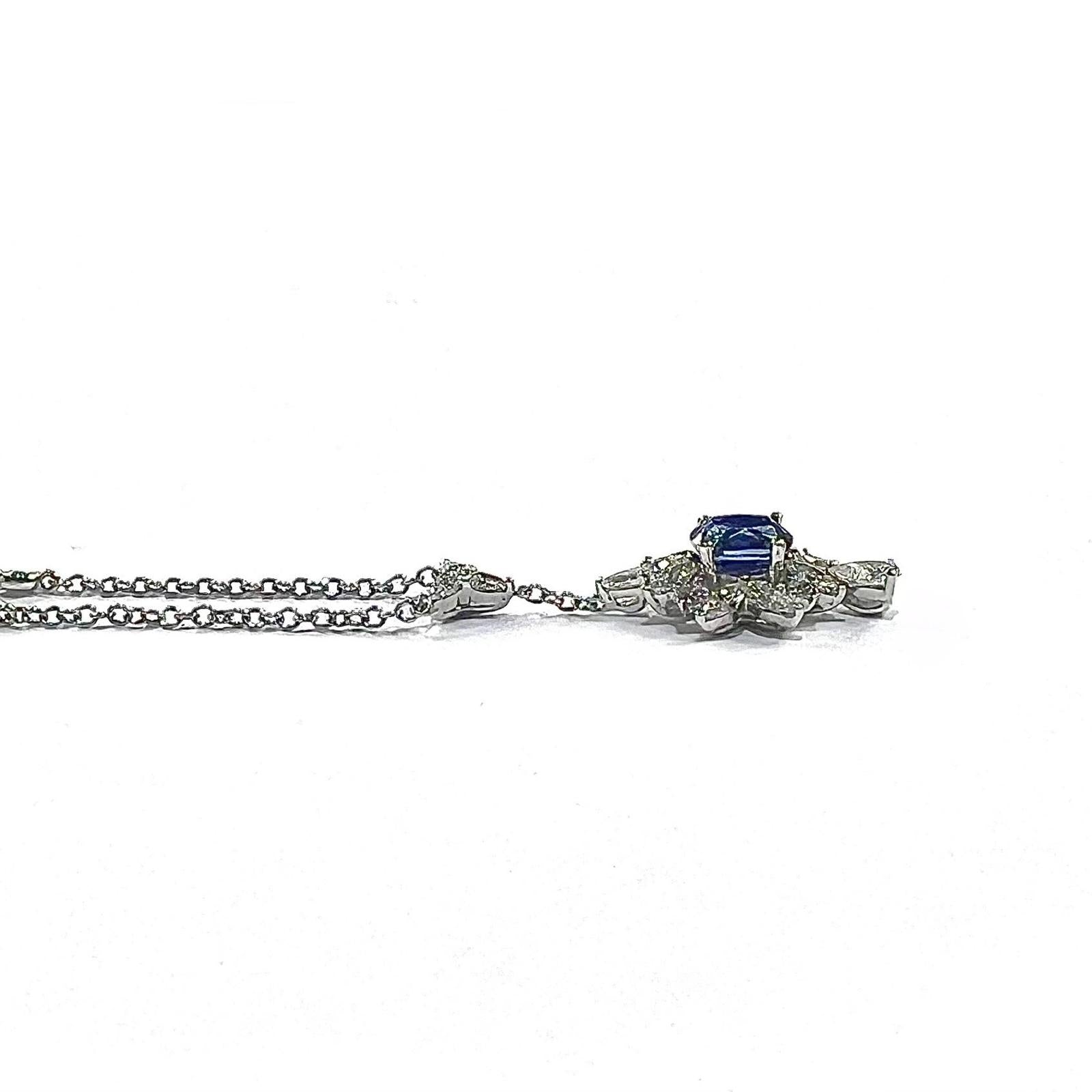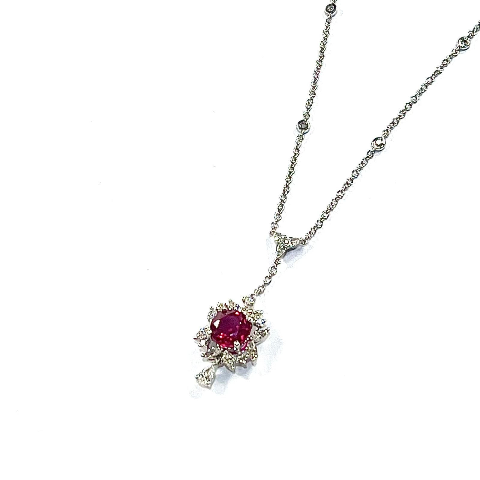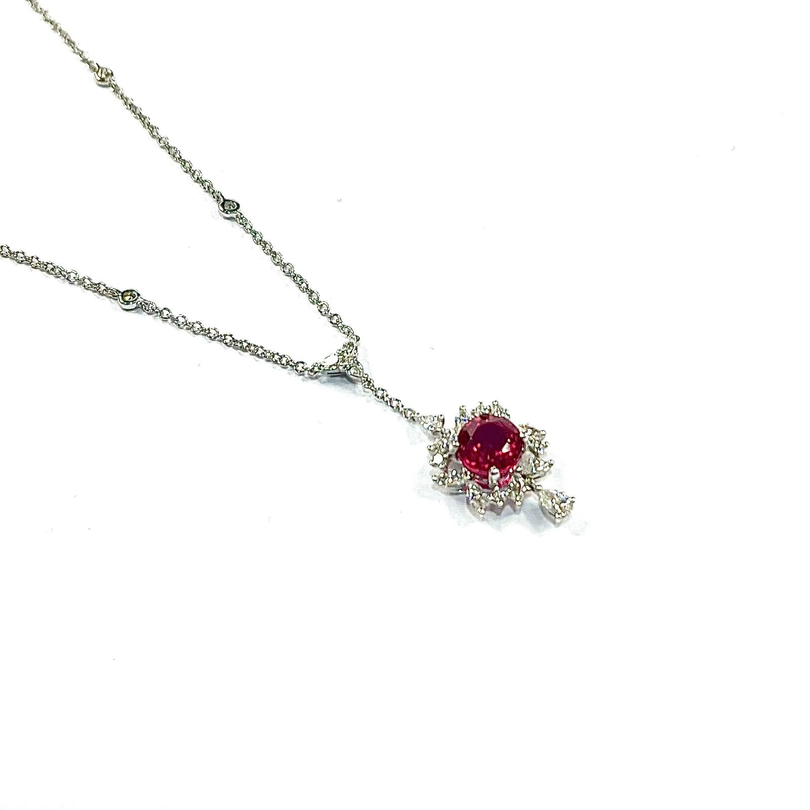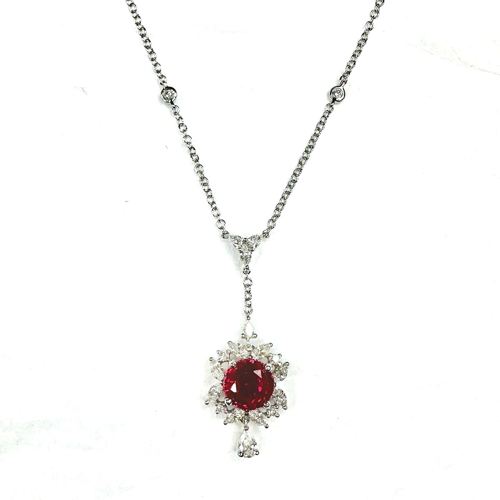A stunning necklace,2 carat Ruby, accented with 8 marquise diamonds totaling 0.54 carats, 5 pear diamonds totaling 0.38 carats, and 8 round diamonds totaling 0.2 carats. Set in 18k white gold for an elegant and sophisticated design. (18k, natural)