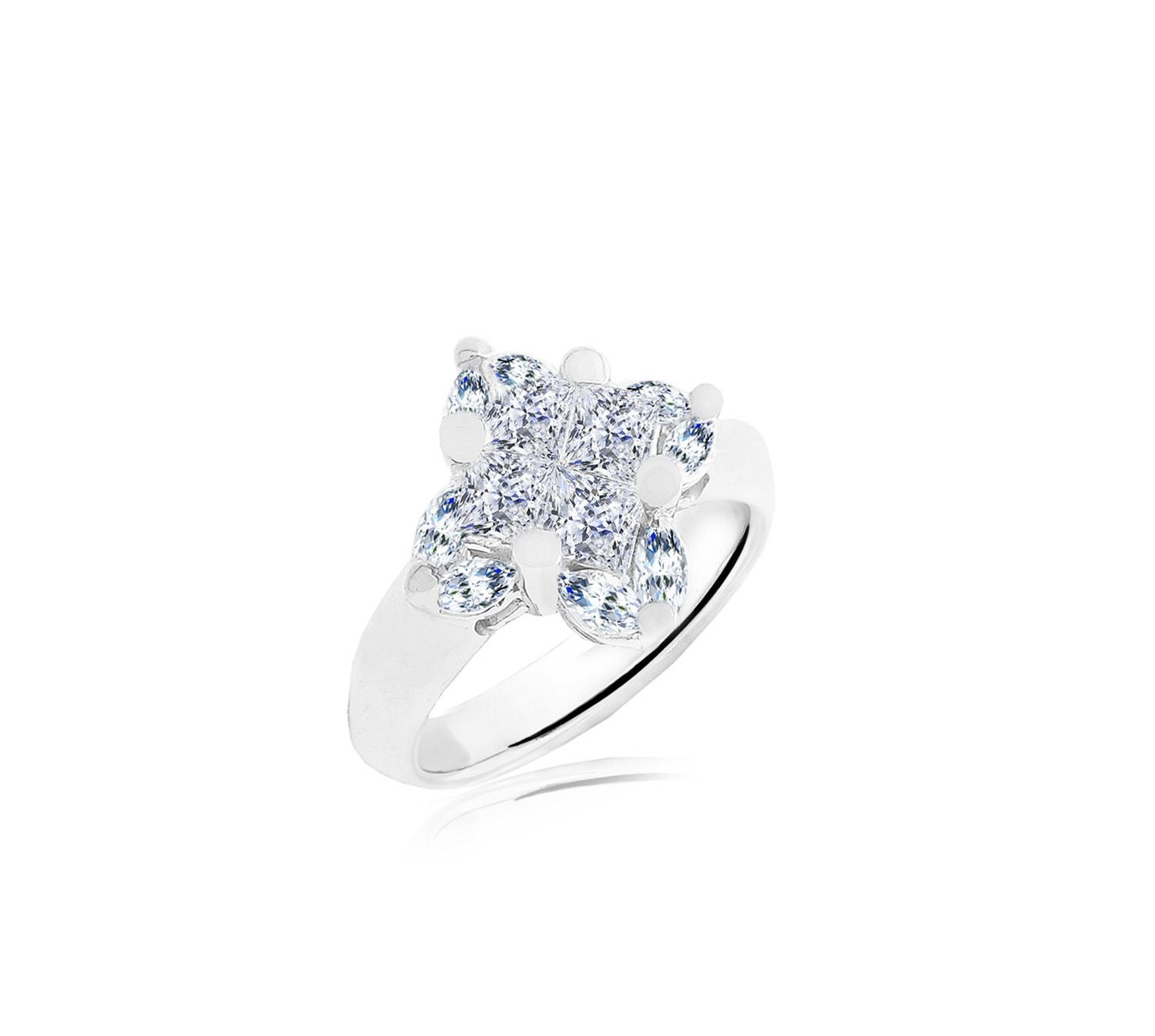 Diamond ring with 4 princess cut diamonds 0.68 carat and 8 marquise shaped diamonds 0.40 carat in 18k gold, white. (18k, Natural)