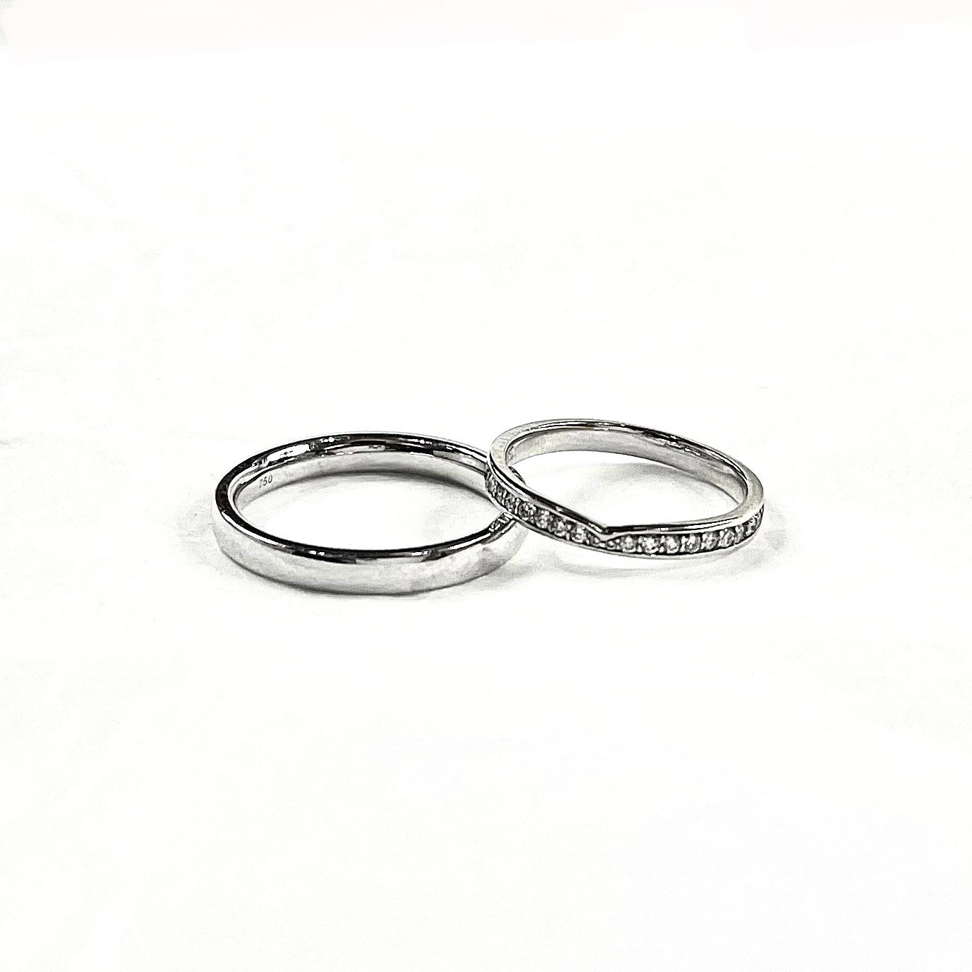 A sleek and modern pair of rings with a focus on comfort and minimalism. The groom’s band is a glossy, smooth design that fits comfortably, while the bride’s band is an eternity ring adorned with diamonds. A subtle, tiny collar in the center adds a touch of unique elegance to this clean and contemporary set.
