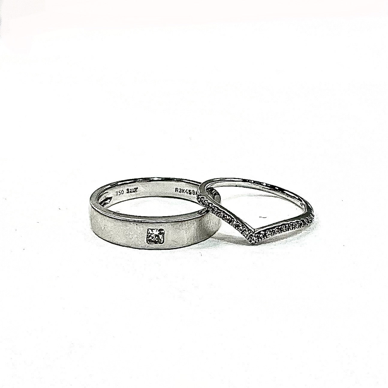 A refined and elegant wedding set. The groom's band features a single princess-cut diamond embedded in a sleek, matte-finished band, giving it a regal yet understated appeal. The bride’s ring is graceful, with a v-shaped design and a row of diamonds, creating a sophisticated and feminine look.