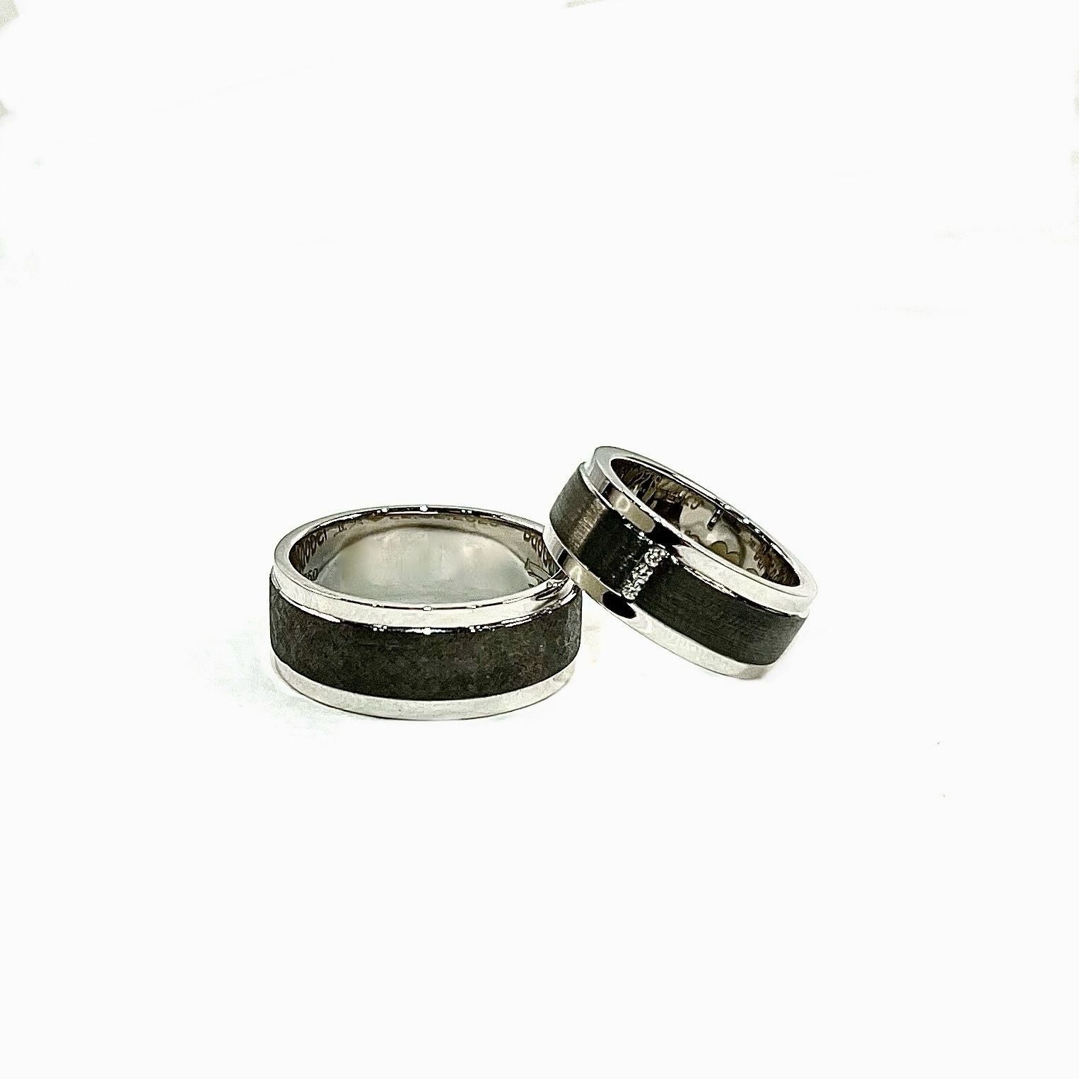 A striking pair of wedding bands that embrace boldness. The men's band is crafted in black gold with a chunky, revolving design and a matte finish, giving it a modern industrial feel. The woman's band complements it with a similarly bold yet refined design, making this set perfect for couples who love a statement piece.