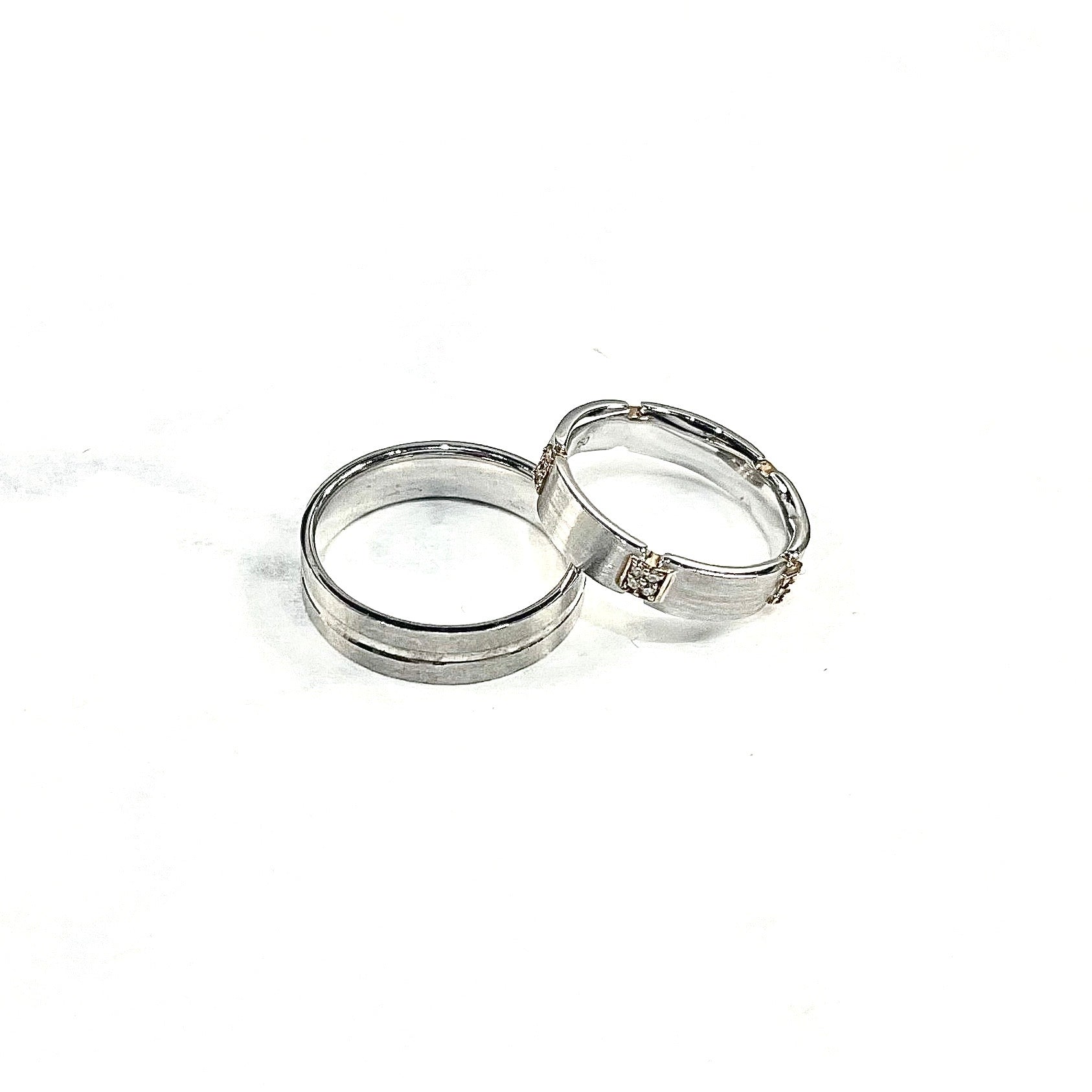A wedding set that merges gothic aesthetics with formal luxury. The groom’s band has a grey matte exterior with an embedded glossy line, adding a sleek contrast. The bride’s ring features six rectangular segments separated by square diamonds, creating a structured yet dramatic appearance, perfect for couples who love a bold and regal style.