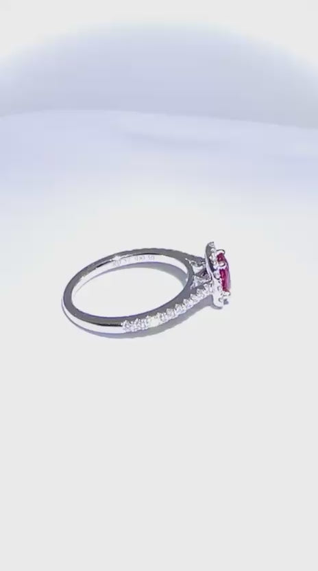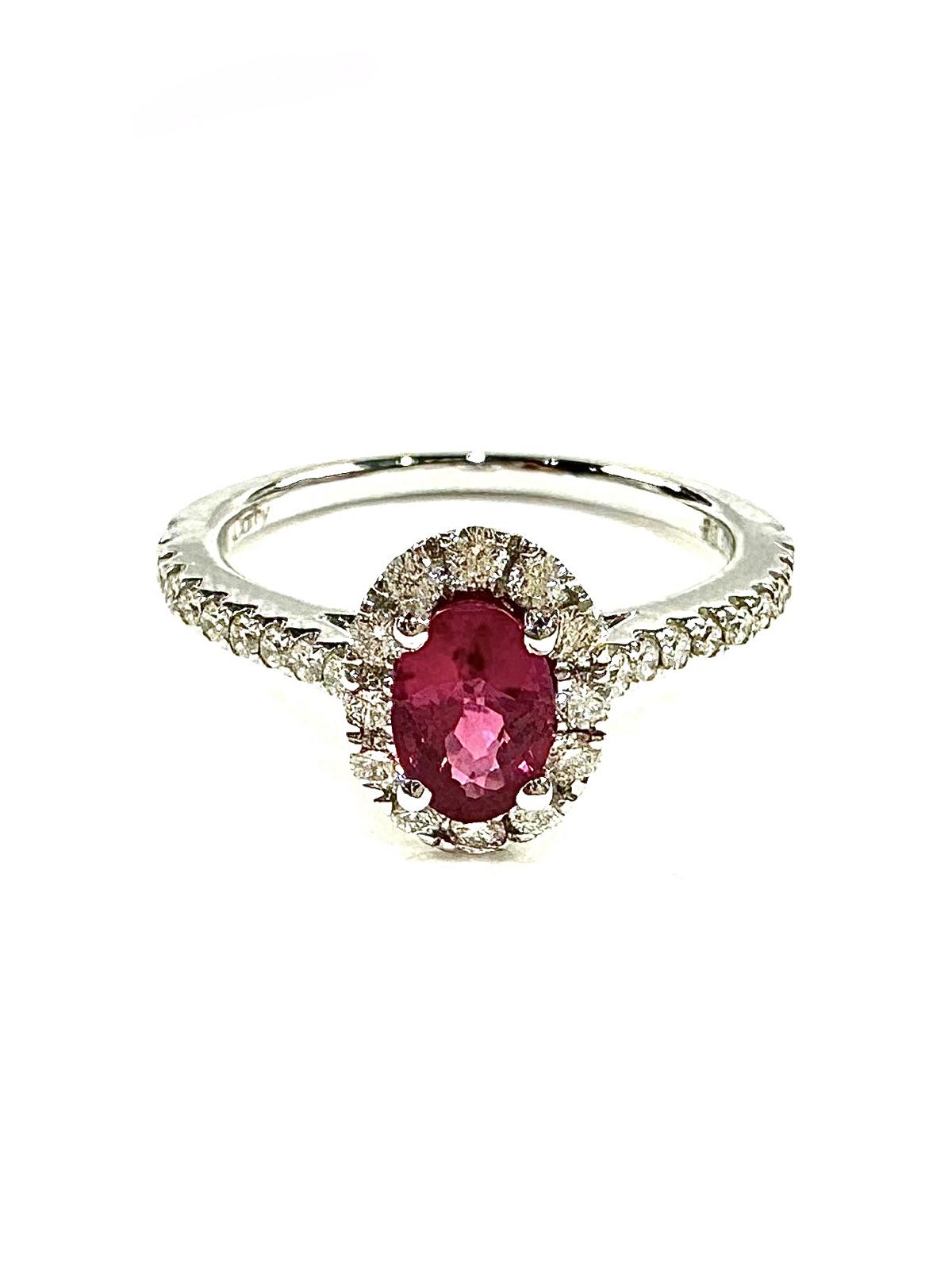 A captivating ring featuring a 0.57-carat oval ruby, encircled by 32 round brilliant diamonds totaling 0.3 carats. Crafted in 18k white gold, this piece radiates timeless elegance. (18k, natural)