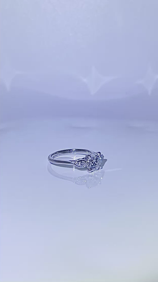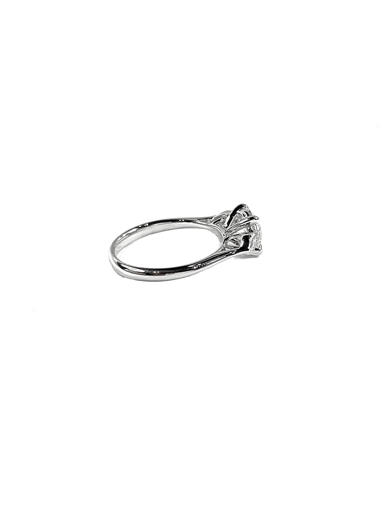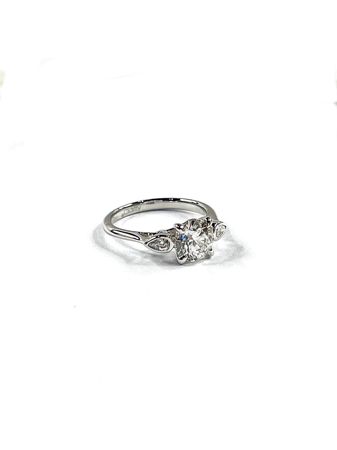 A refined take on classic romance, this ring features a round brilliant center diamond flanked by two pear-shaped side diamonds. The soft curves of the pears draw the eye inward, accentuating the fire and symmetry of the center stone. With its clean silhouette and graceful taper, this trilogy design captures the beauty of balance, light, and enduring love.