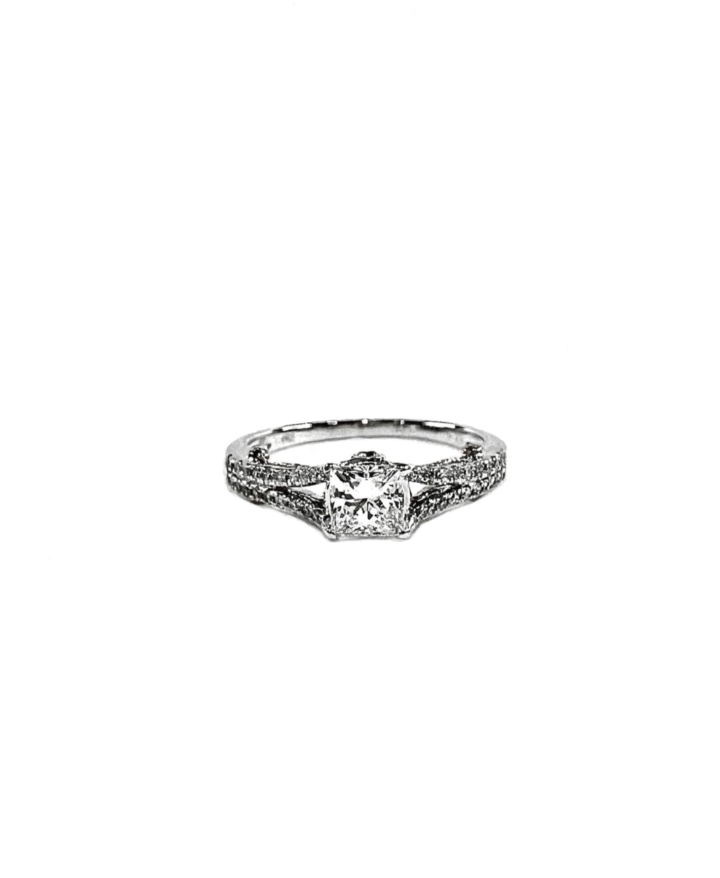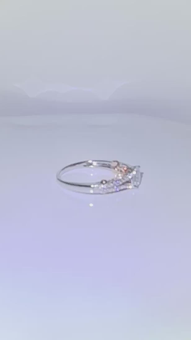 A bold yet elegant expression of brilliance, this ring features a princess-cut center diamond embraced by a refined arrangement of round side diamonds. The strong geometry of the princess cut is complemented by the gentle sparkle along the band, creating a graceful balance of structure and light. A timeless design that celebrates clean lines, clarity, and modern romance.