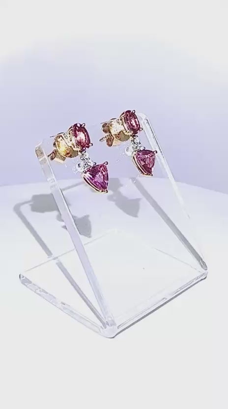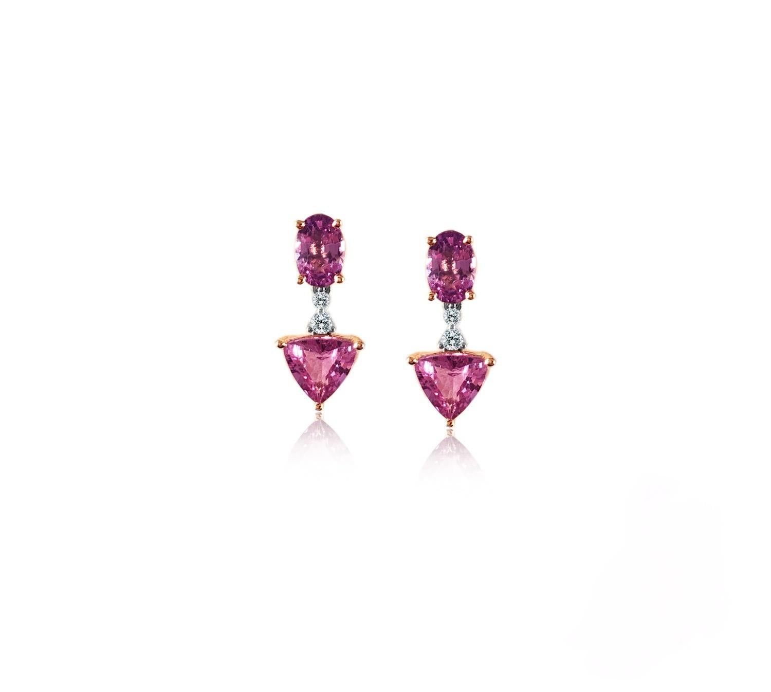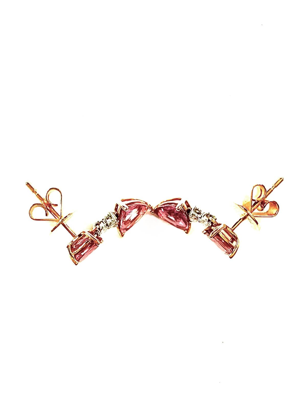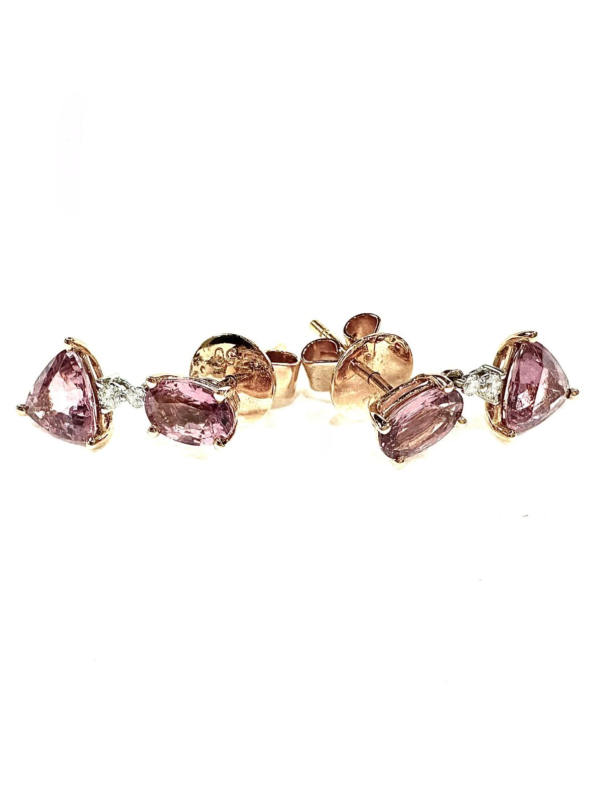 Earrings with 4 pink sapphires (2pcs of Oval Sapphires and 2 pcs of Triangle Sapphires) 2.80 carat and 4 round brilliant diamonds 0.06 carat in 18k gold, rose. (18k, Sapphire)