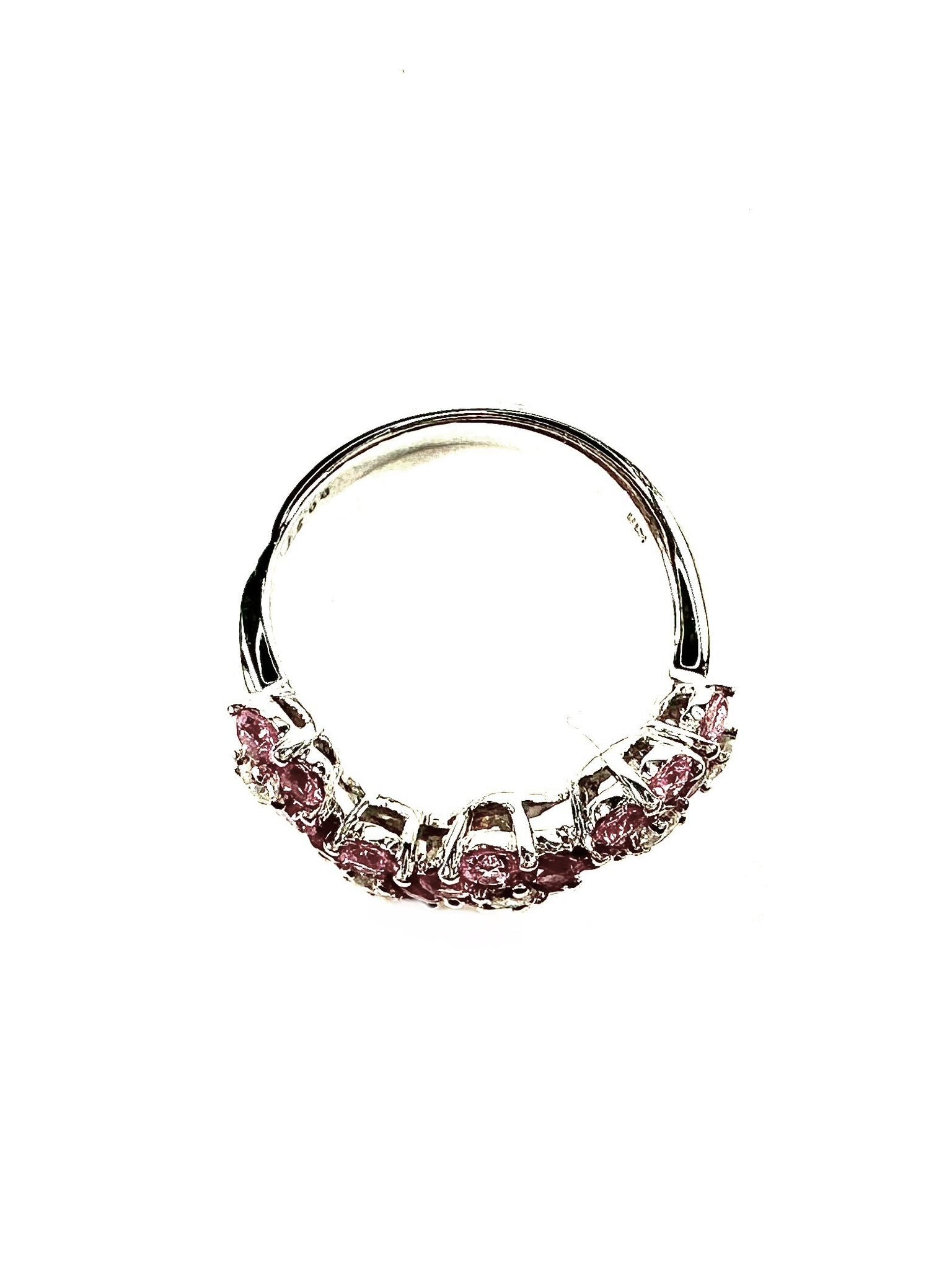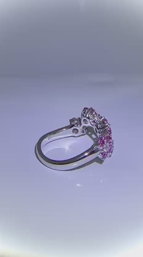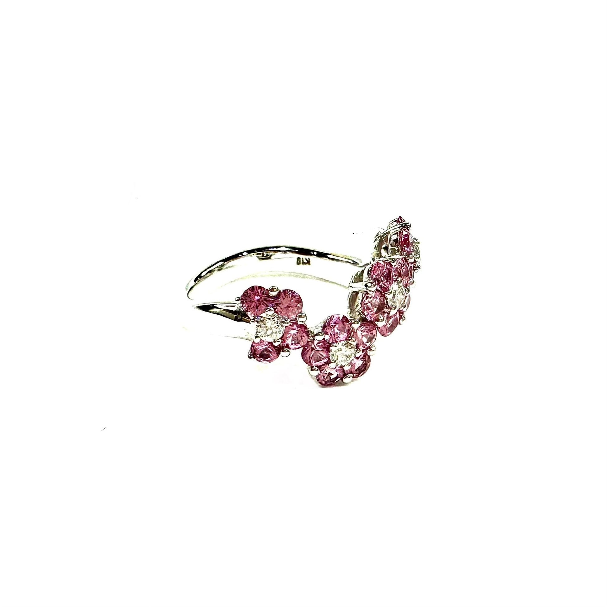 Pink sapphire diamond ring with 5 round brilliant diamonds 0.27 carat and 23 round pink sapphires 1.56 carat in 18k gold, white. (18k, Sapphire)