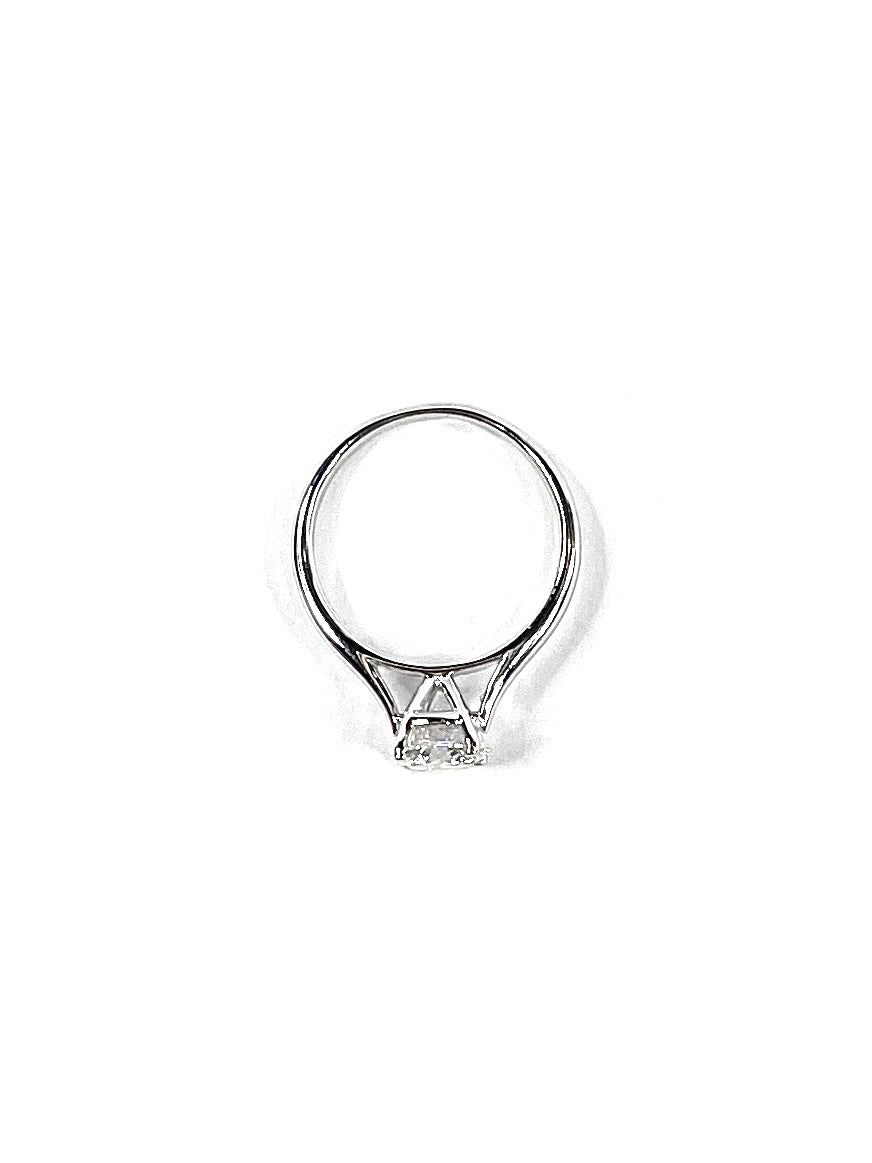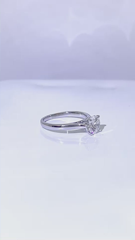 A celebration of timeless sophistication, this ring features a 1 carat round brilliant diamond, chosen for its exceptional fire and clarity. Set in a clean, minimalist band, the classic design draws focus to the brilliance of the center stone