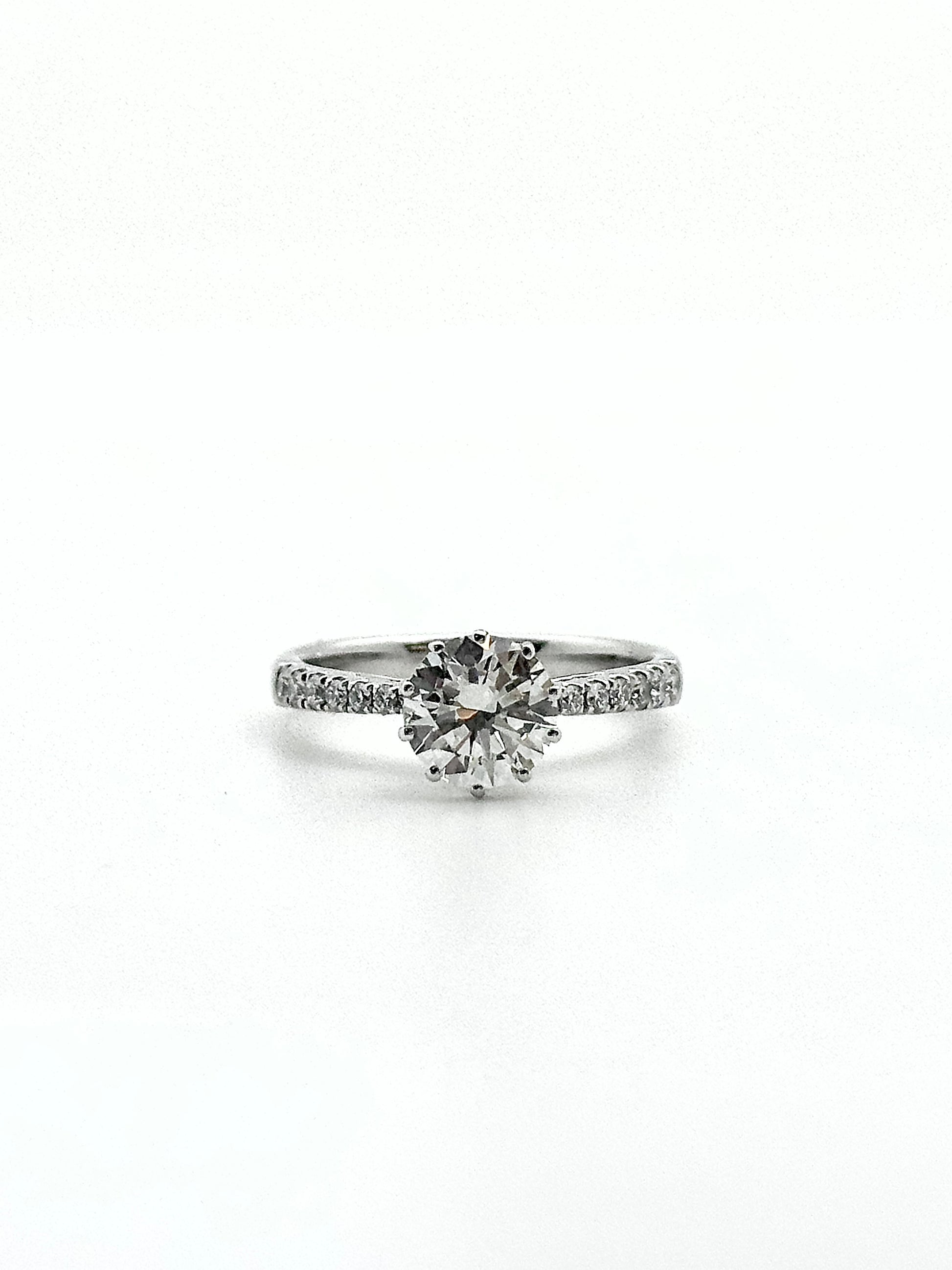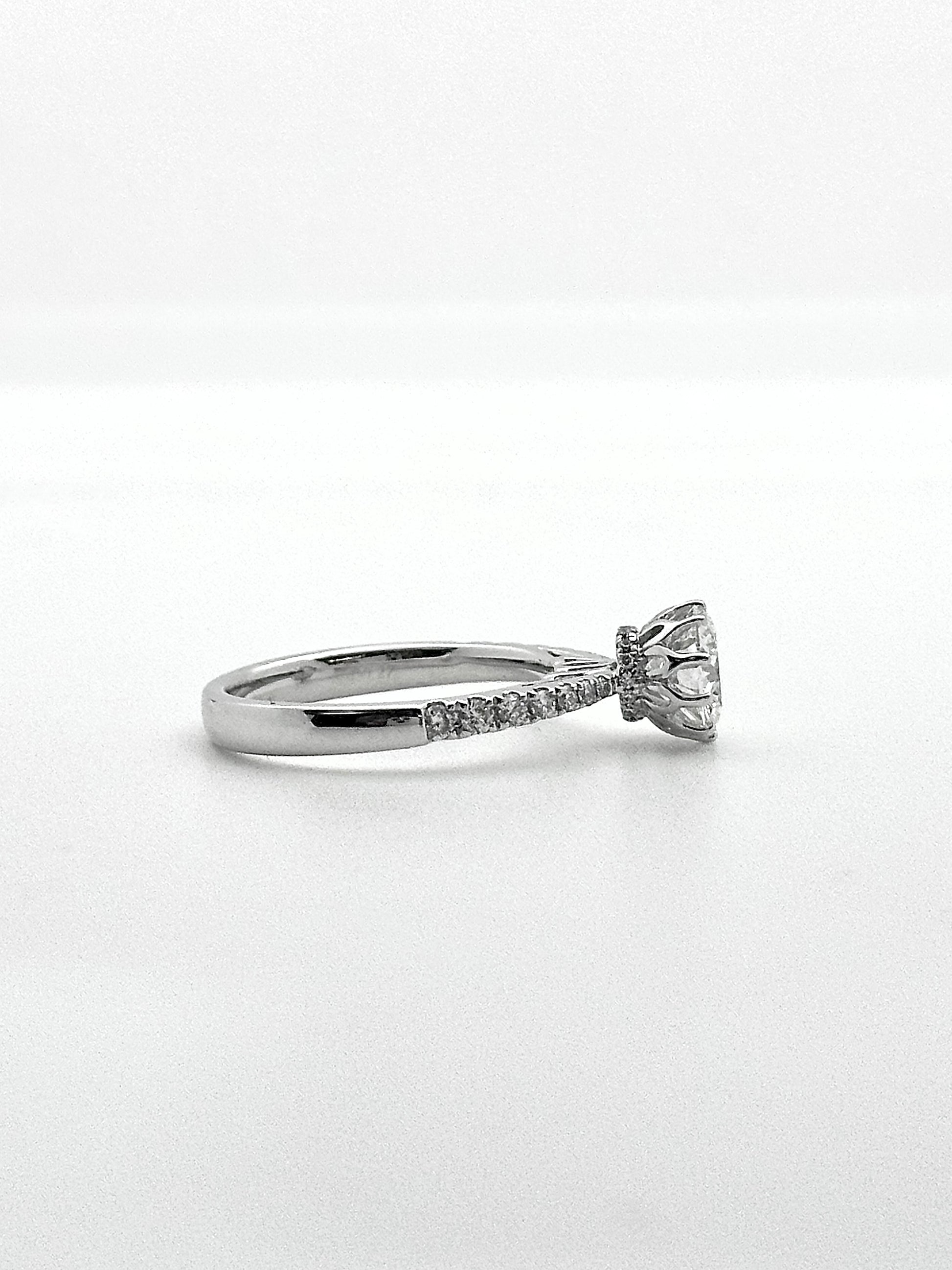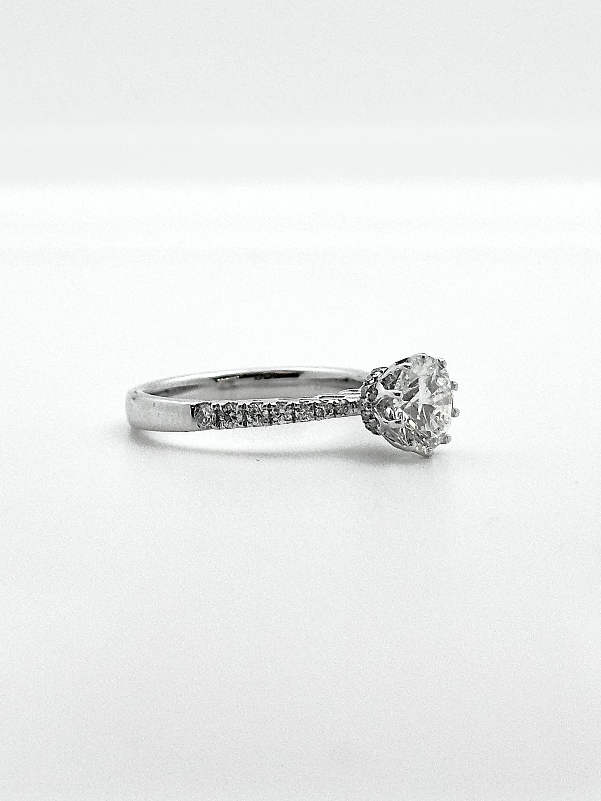 Defined by clarity and refined detail, this ring centres on a 1.2 carat colorless round brilliant diamond, chosen for its exceptional light return and timeless appeal. A line of finely set round diamonds along the band adds gentle brilliance, complementing the centre stone without distraction.