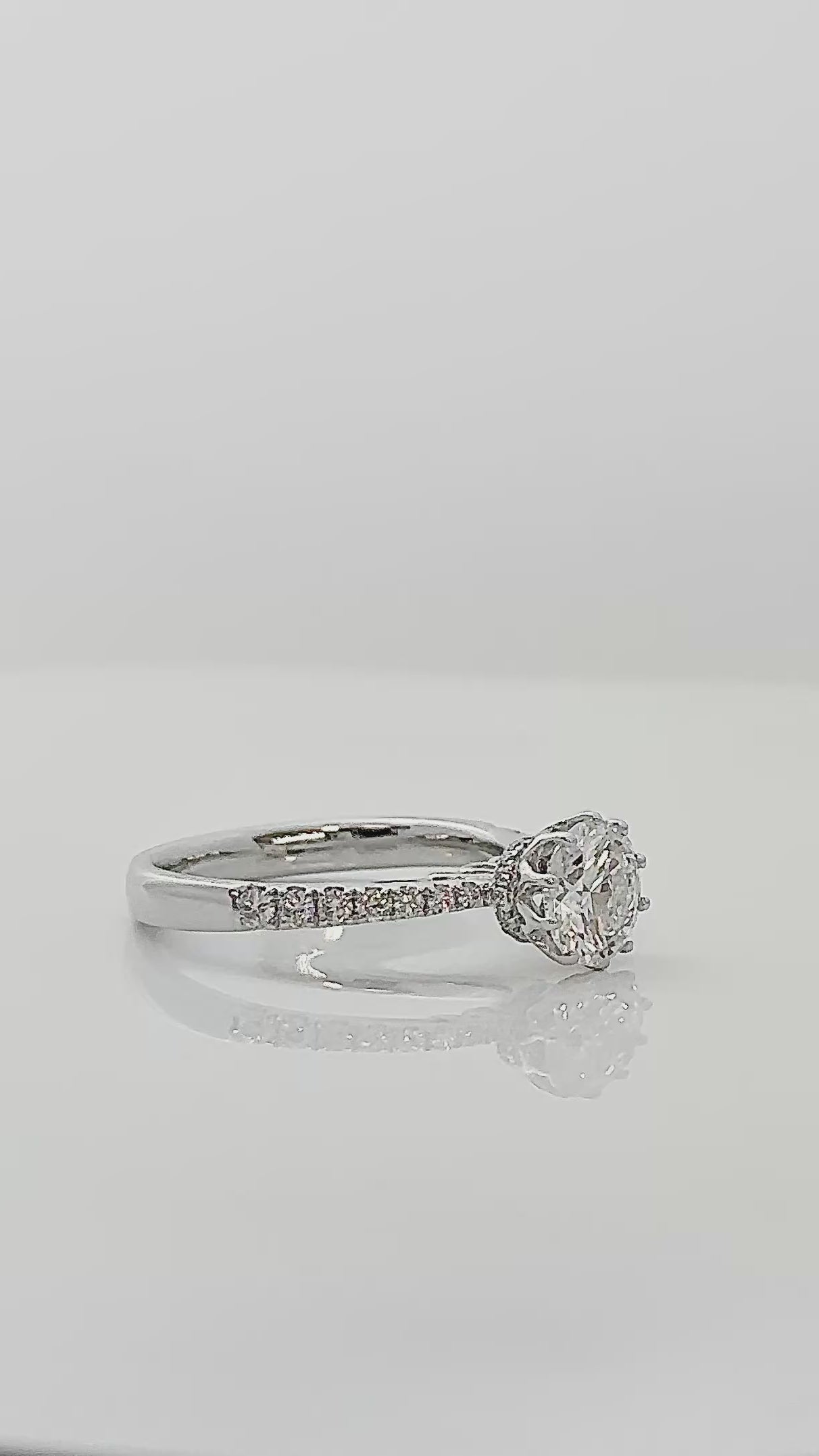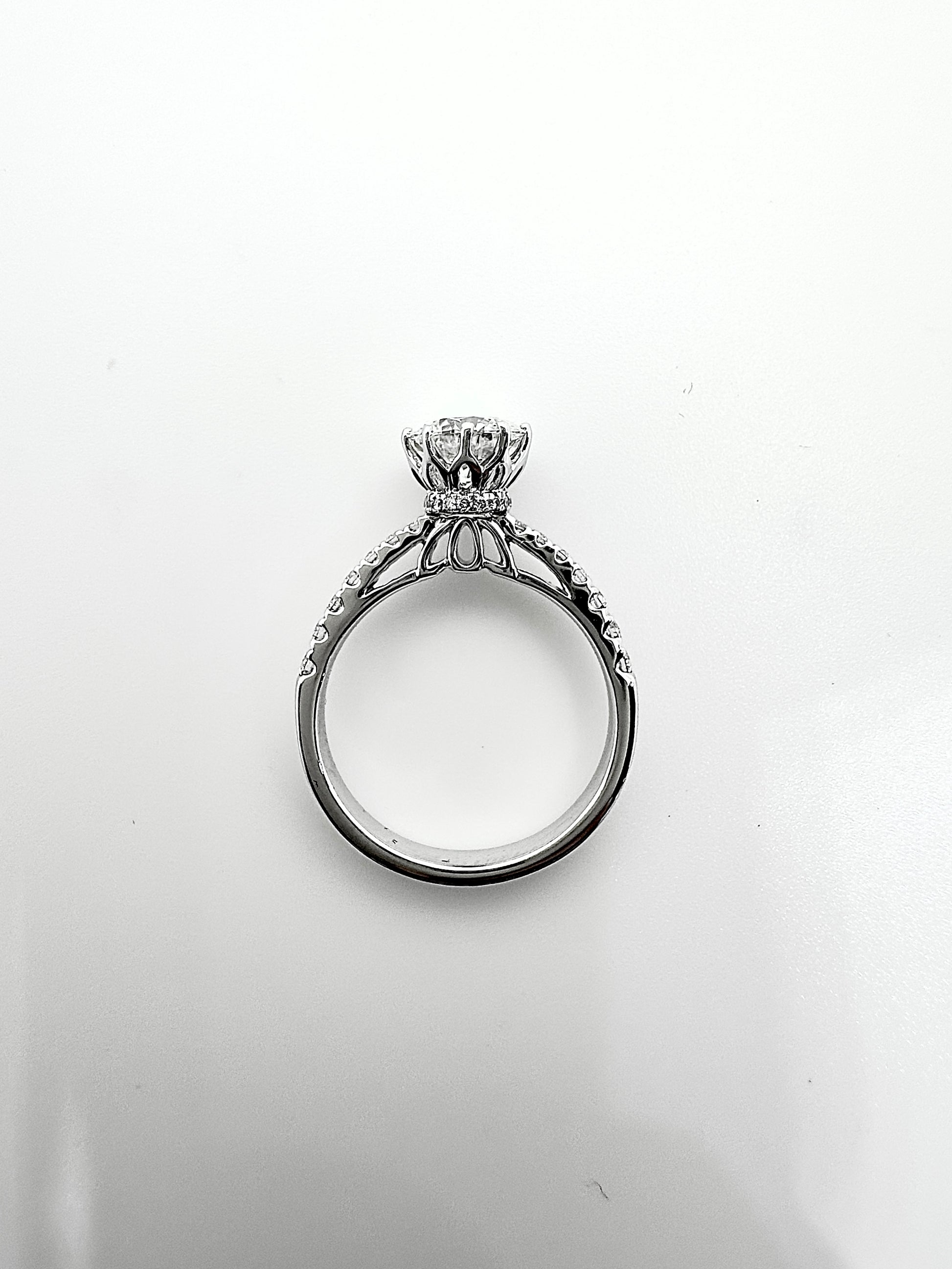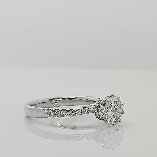 Defined by clarity and refined detail, this ring centres on a 1.2 carat colorless round brilliant diamond, chosen for its exceptional light return and timeless appeal. A line of finely set round diamonds along the band adds gentle brilliance, complementing the centre stone without distraction.