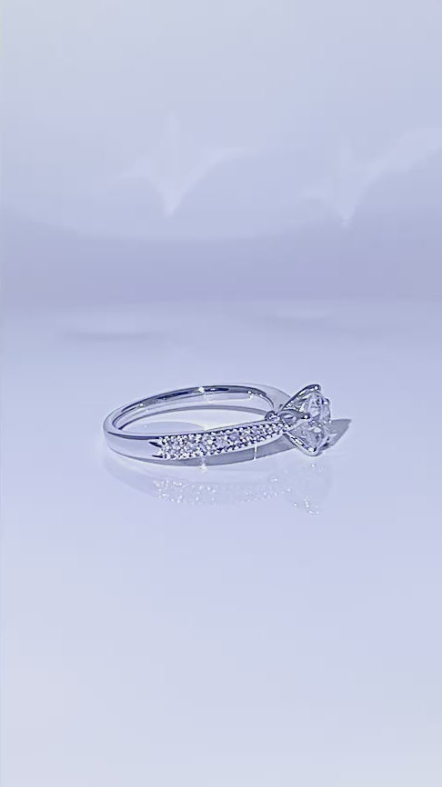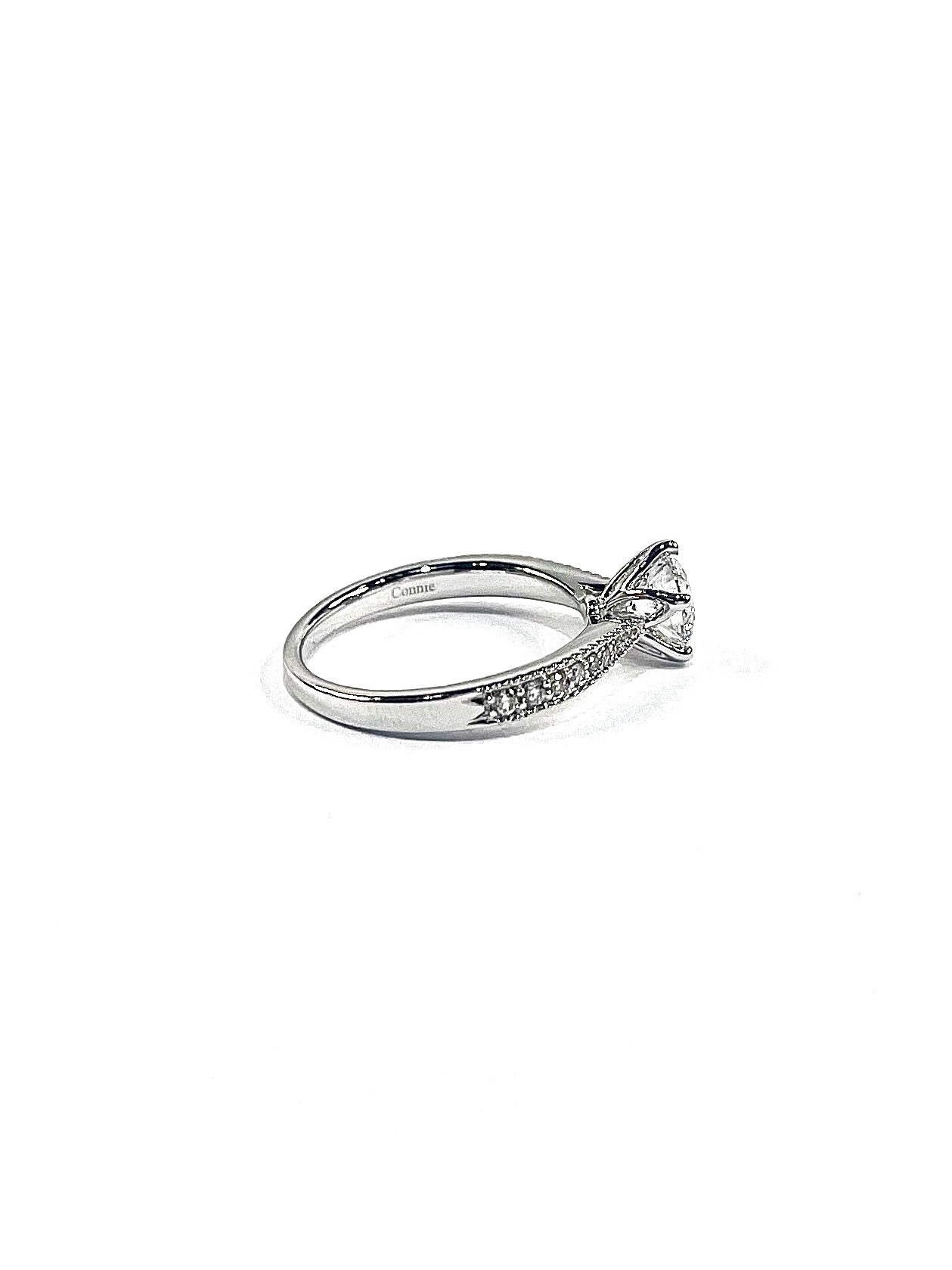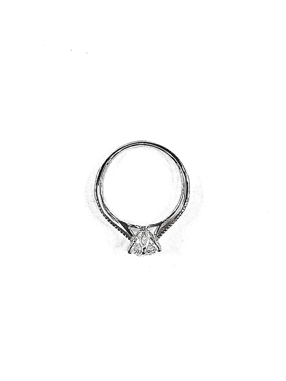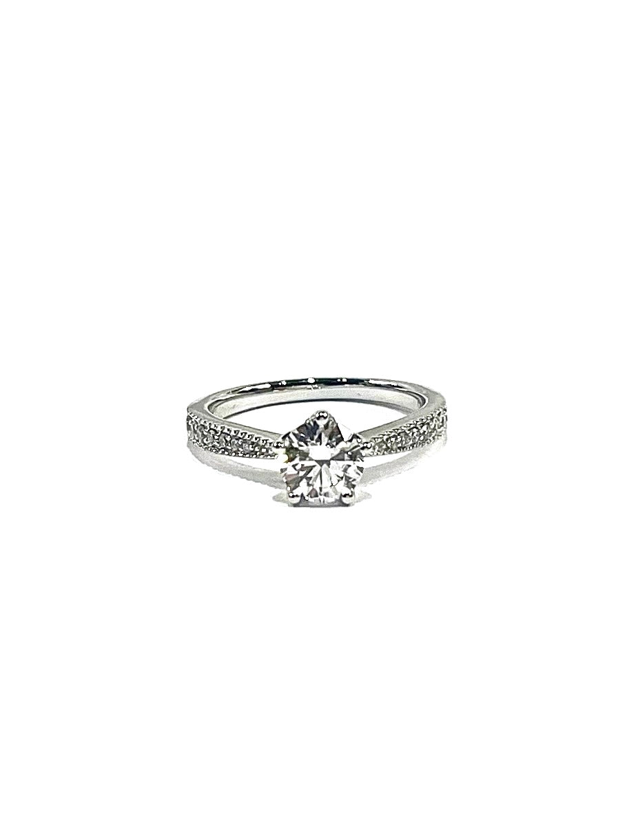 A tribute to brilliance and balance, this refined design showcases a 1.00 carat round brilliant diamond chosen for its exceptional sparkle and clarity. Set at the heart of the ring, the center stone is accented by a graceful row of approximately 14 round brilliant diamonds, adding soft shimmer and dimension.