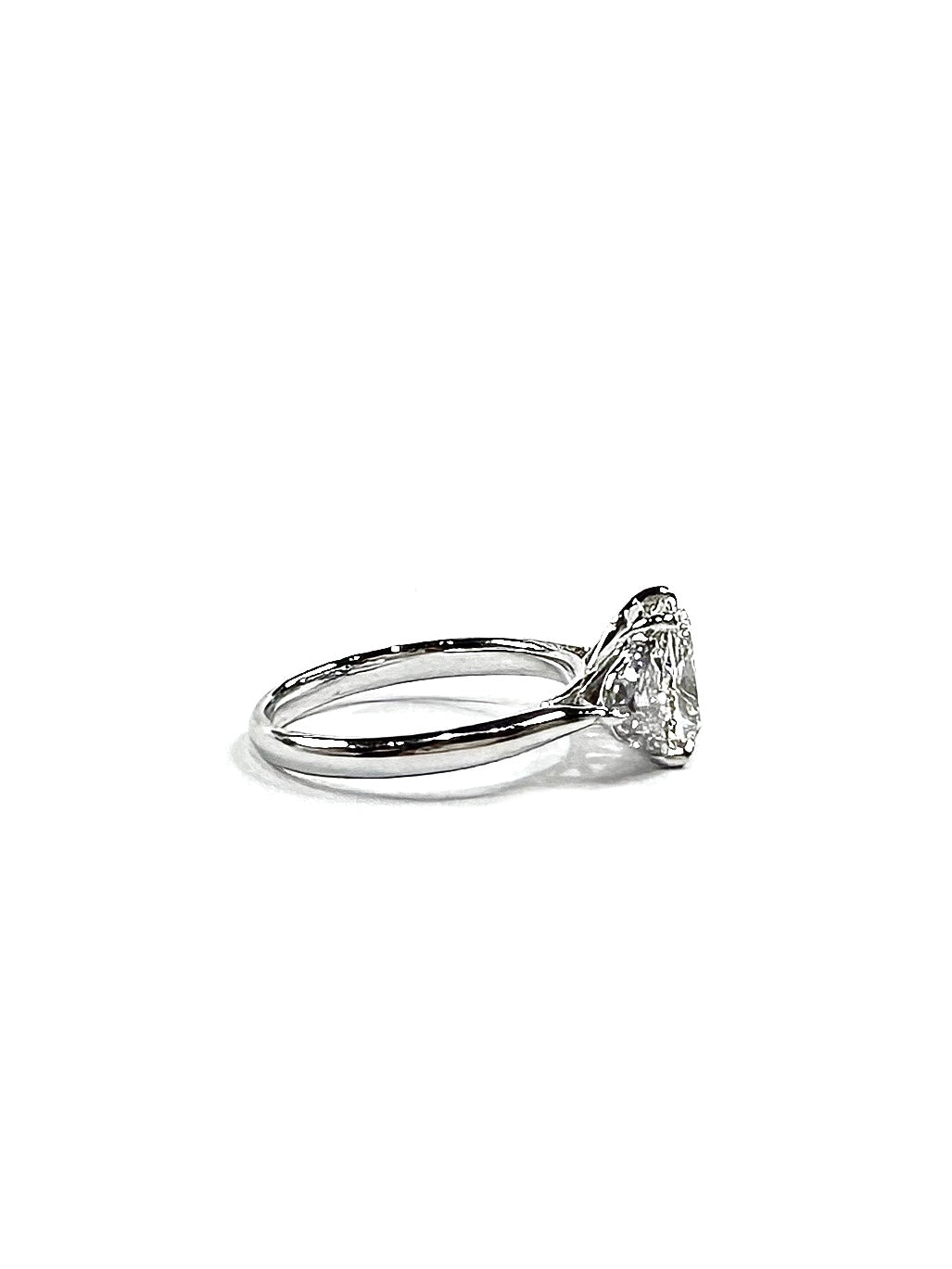 A refined interpretation of timeless beauty, this ring features a 1.60-carat round brilliant diamond embraced by two half-moon side stones. The balanced trio creates a luminous harmony, highlighting the brilliance of the center stone while adding depth and character. With its flowing design and graceful proportions, this piece is a sophisticated expression of love, unity, and enduring elegance.