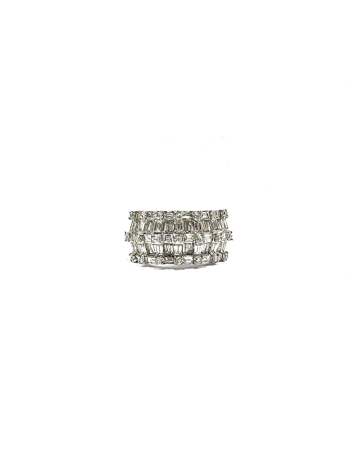 Diamond ring with 56 tapered diamonds 2.19 carat and 21 round brilliant diamonds 0.41 carat in 18k gold, white. (18k, Natural)