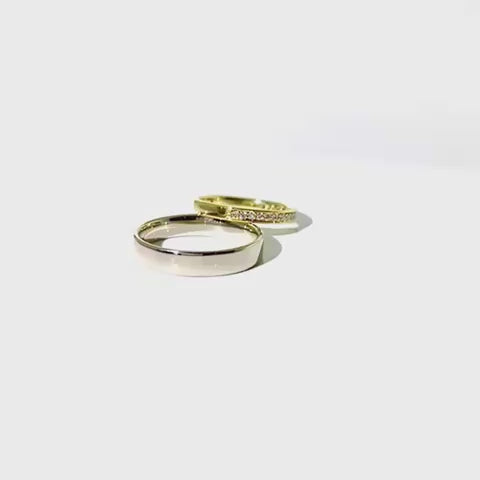 A timeless and elegant pair of rings that embody simplicity and sophistication. The groom’s band is a smooth and polished champagne gold ring, offering a refined and comfortable fit. The bride’s band is a half-circle eternity ring, beautifully set with sparkling diamonds in radiant yellow gold. Together, this set symbolizes harmony and everlasting love, with a perfect balance of minimalism and brilliance.